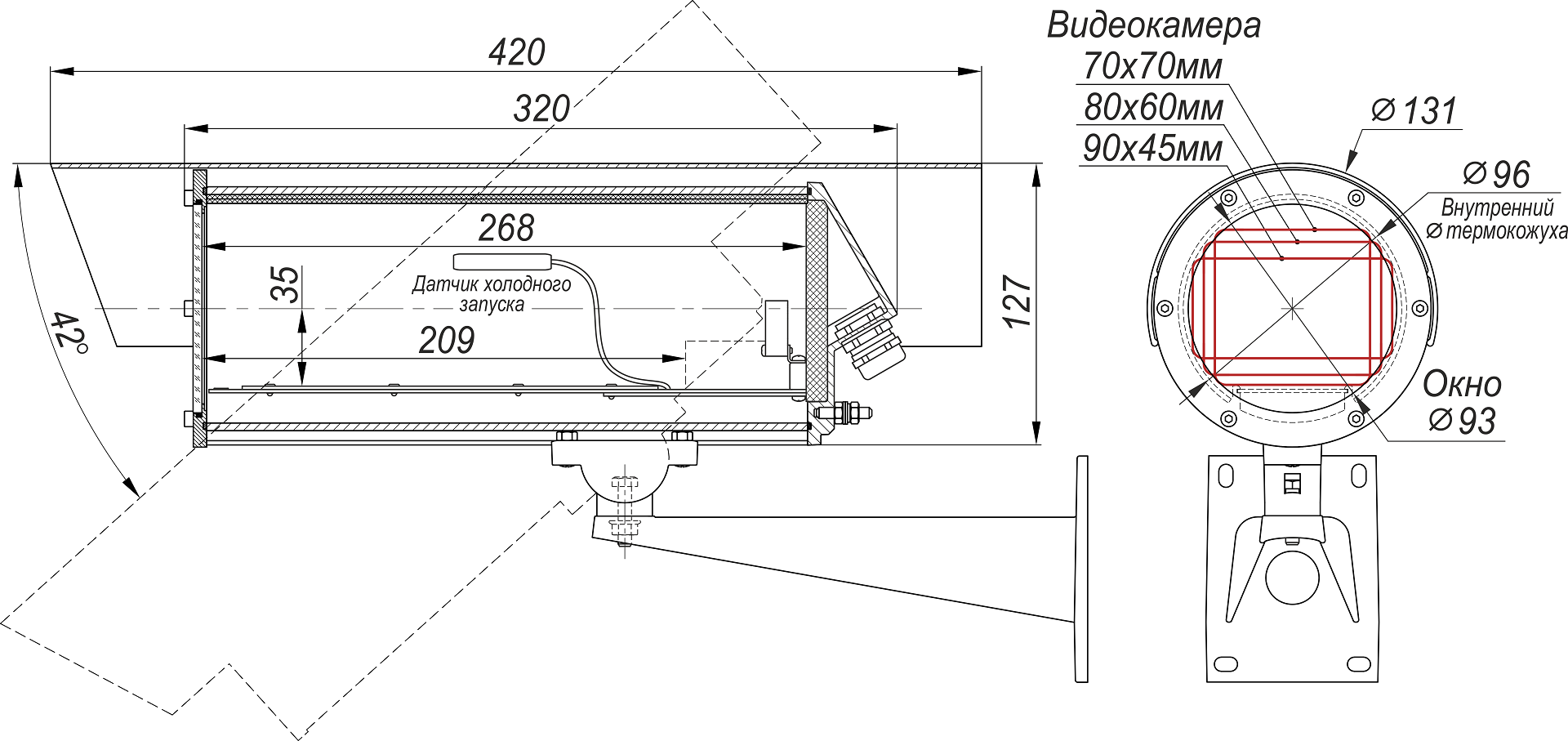 Терсокожух для видеокамеры с возможностью установки стеклоочистителя СО-2. Класс защиты IP66/IP68. Рабочий объем 70х70х215 мм. Напряжение питания термокожуха 24В DC/AC. Напряжение питания видеокамеры 12В DC или 24В DC/AC. Мощность обогрева 31/21 Вт. Диапазон рабочих температур -60°С/-40°С…+50°C. Холодный пуск. Два гермоввода под кабель диаметром 6-10мм. В комплекте настенный кронштейн и солнцезащитный козырек.