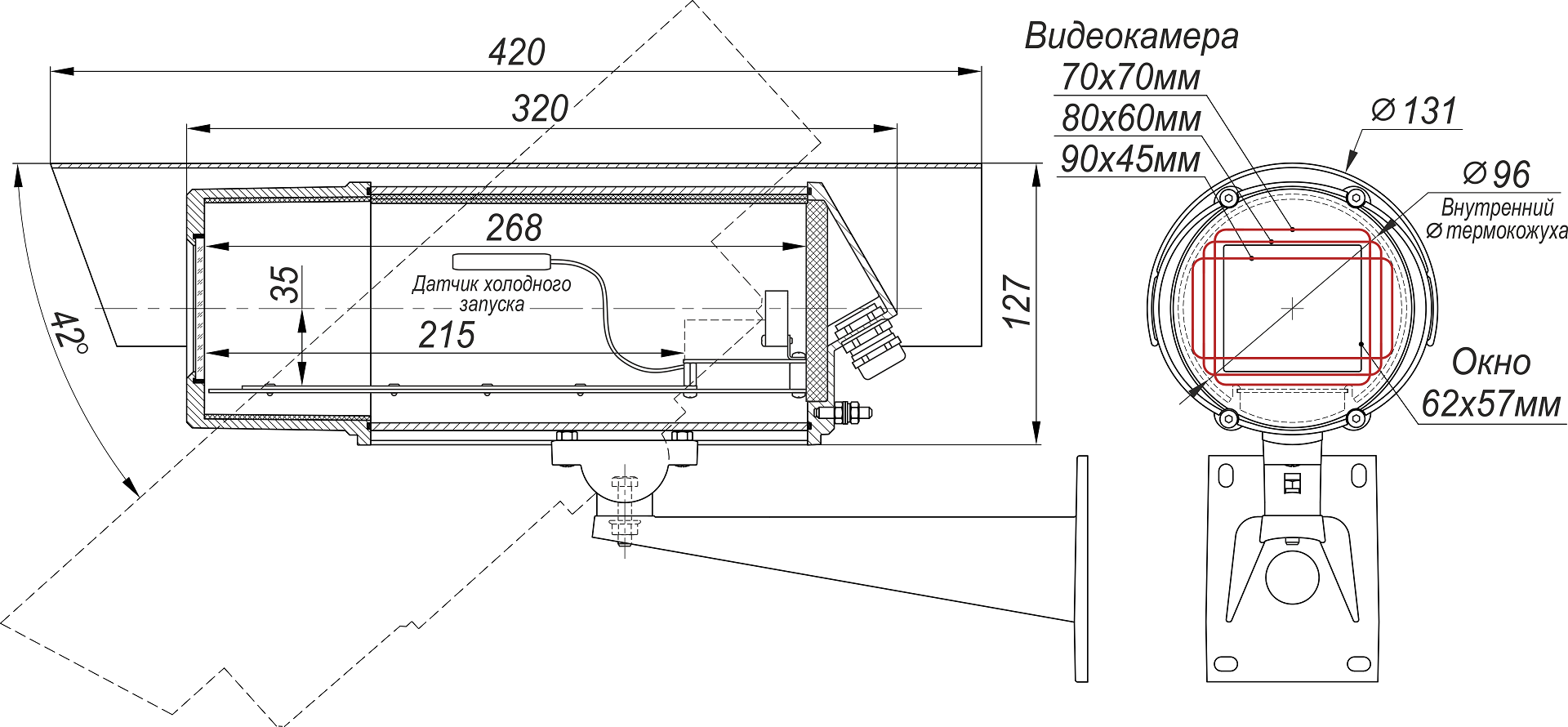 Термокожух для видеокамеры. Класс защиты IP66/IP68. Рабочий объем 70х70х215 мм. Питание термокожуха по стандарту IEEE 802.3at (PoE+). Питание видеокамеры по стандарту IEEE 802.3af (PoE). Мощность обогрева 25 Вт. Диапазон рабочих температур -45°С…+50°C. Холодный пуск. Два гермоввода под кабель диаметром 4-5мм, позволяющие вводить кабель с обжатой вилкой RJ-45. В комплекте настенный кронштейн и солнцезащитный козырек.