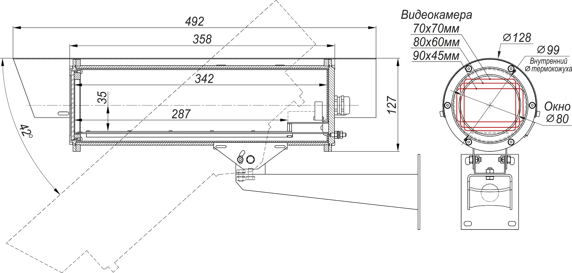 Термокожух для видеокамеры из нержавеющей кислотостойкой аустенитной стали (12Х18Н10Т). Класс защиты IP66/IP68. Рабочий объем 70х70х287 мм. Напряжение питания термокожуха 24В DC/AC. Напряжение питания видеокамеры 12В DC или 24В DC/AC. Мощность обогрева 31/21 Вт. Диапазон рабочих температур -60°С/-40°С…+50°C. Холодный пуск. Два гермоввода под кабель диаметром 7-12мм. В комплекте настенный кронштейн и солнцезащитный козырек.