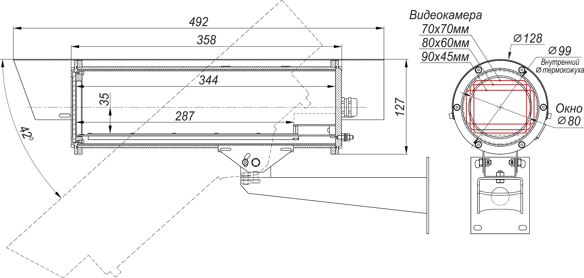 Термокожух для видеокамеры из нержавеющей кислотостойкой аустенитной стали (12Х18Н10Т). Степень защиты IP66/IP68. Рабочий объем 70х70х287 мм. Габариты, мм: Lнар. 492, øнар. 128. Напряжение питания термокожуха 12V DC/AC. Мощность обогрева 16/11 Вт. Диапазон рабочих температур -60°С…+50°C (с холодным пуском -25°С/-15°С ÷ +50°C). Максимальная потребляемая мощность (включая видеокамеру) 38/33 Вт. Два гермоввода под кабель диаметром 7-12мм. В комплекте настенный кронштейн и солнцезащитный козырек.