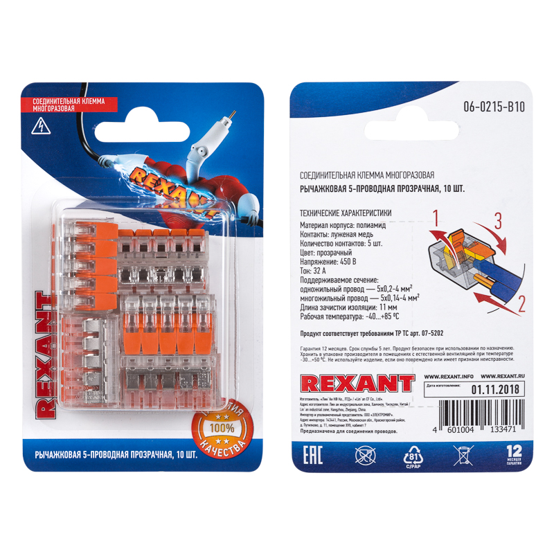 Многоразовые рычажковые прозрачные клеммы REXANT - это один из самых быстрых, надёжных и удобных способов монтажа проводников при небольшой потребности в пространстве в точке коммутации в условиях нехватки и ограничения площади.Материал корпуса: полиамидКонтакты: луженая медь Количество контактов: 5Цвет: прозрачныйНапряжение: 450 В Ток: 32 А Поддерживаемое сечение: 5x0,2-4 мм² (одножильный провод), 5x0,14-4 мм² (многожильный провод) Длина зачистки изоляции: 11 мм Рабочая температура: –40...+85 °С