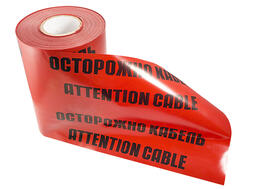 Лента сигнальная «Осторожно кабель» красного цвета, с нанесённым логотипом «Осторожно кабель. Attention cable» черного цвета. Применяется для идентификации электрических кабелей, обеспечивает экономию на материалах, используемых для защиты силового кабеля.