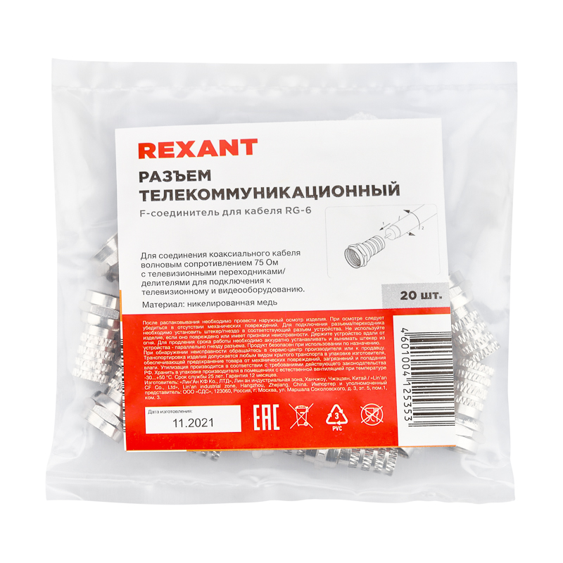 РАЗЪЕМ F-разъем RG-6 REXANT предназначен для соединения коаксиального кабеля волновым сопротивлением 75 Ом с телевизионным и видеооборудованием (ресиверы, телевизоры, всевозможная видеоаппаратура и т.д.). Разъем данного вида не имеет непосредственного штекера, поэтому роль штекера выполняет центральная жила кабеля, что позволяет избежать дополнительных потерь сигнала. F-коннектор изготовлен из никелированного сплава меди (биметалл). Разъем устанавливается на кабель методом накрутки гильзы разъема на внешнюю оболочку кабеля после соответствующей зачистки контактов и не требует применения каких-либо специальных инструментов. F-штекер выступает в роли своеобразного экрана за счет накручивания на оплетку кабеля для выполнения роли электрического контакта. Такой высокочастотный соединитель имеет ряд положительных преимуществ: - позволяет соединять кабель без пайки контактов в удаленном месте (на крыше дома или обширных складских комплексах);- имеет высокую стойкость соединения разъем-кабель к внешним механическим воздействиям;- обладает низкой стоимостью.F-разъем RG-6 подходит для кабелей типа RG-6 и других коаксиальных кабелей (SAT-50, SAT-703, DG-113), имеющих наружный диаметр около 6.8 мм. Данный ТВ компонент незаменим для построения сети кабельного телевидения, различных видеосистем и подключения эфирного телевидения.
