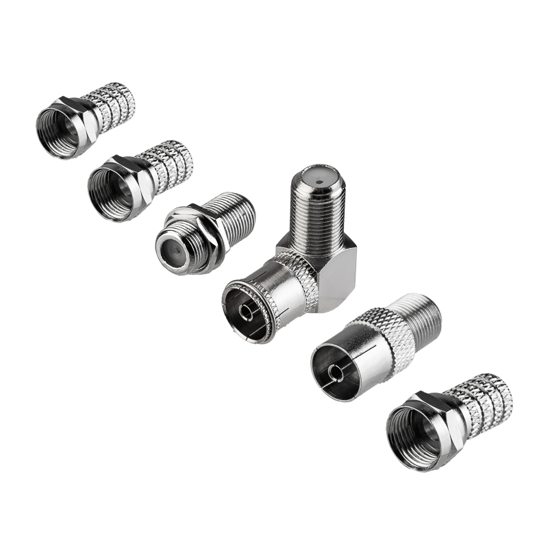 Набор антенных разъемов №9 предназначен для оконцевания кабелей. В наборе 1 угловой переходник (гнездо F – гнездо TV), 1 переходник (гнездо F – гнездо TV), 1 переходник (гнездо F – гнездо F, бочка с кольцом) и 4 F-разъема RG-6.
