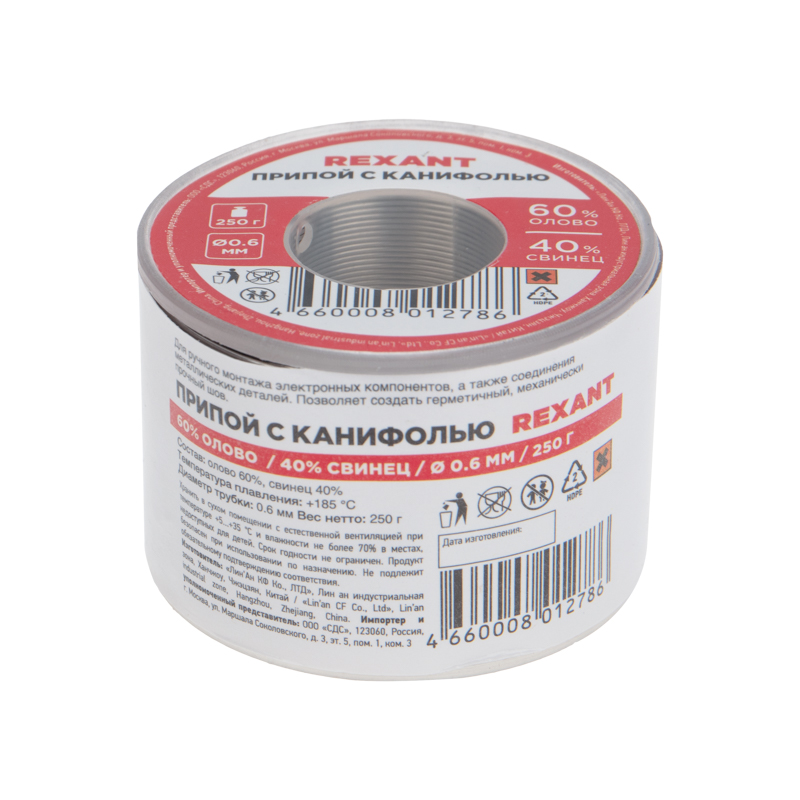 Припой с канифолью REXANT представляет собой проволоку (диаметром 0,6 мм) из сплава олова (60 %) и свинца (40 %). Используется в пайке для соединения деталей между собой и позволяет создать герметичный, механически прочный (устойчивый) шов. Нагреваясь до температуры плавления (183...188 °C) припой: расплавляется, смачивает спаиваемый металл и, растекаясь по нему — заполняет место между соединяемыми деталями.В свою очередь флюс канифольный активный (MC-20A) помогает сделать паянное соединение более прочным! Убирая окислительную плёнку со спаиваемых поверхностей и защищая их от дальнейшего окисления при пайке. Содержание флюса в припое — 2,2 %.Как видно из вышесказанного припой с канифолью REXANT — самое что ни на есть «два в одном»: припой и флюс на катушках по 250 грамм.