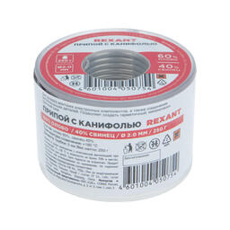 Припой с канифолью REXANT представляет собой проволоку (диаметром 2 мм) из сплава олова (60 %) и свинца (40 %). Используется в пайке для соединения деталей между собой и позволяет создать герметичный, механически прочный (устойчивый) шов. Нагреваясь до температуры плавления (183...188 °C) припой: расплавляется, смачивает спаиваемый металл и, растекаясь по нему — заполняет место между соединяемыми деталями.