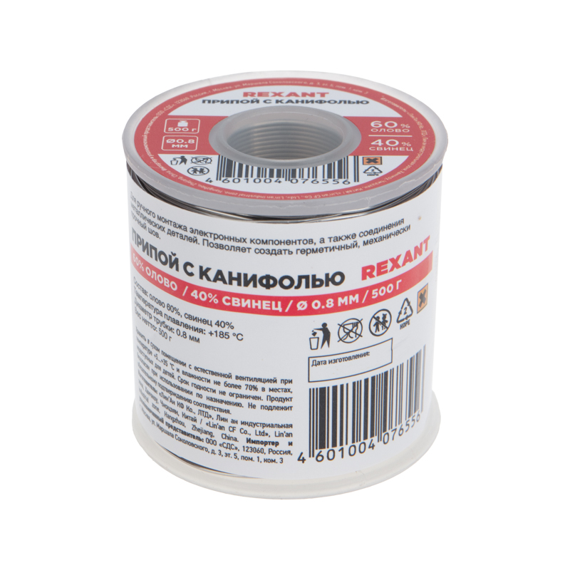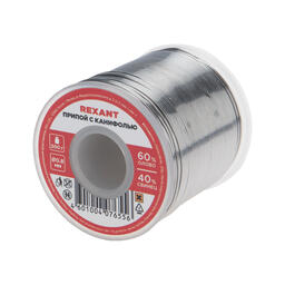 Припой с канифолью REXANT представляет собой проволоку (диаметром 0,8 мм) из сплава олова (60 %) и свинца (40 %). Используется в пайке для соединения деталей между собой и позволяет создать герметичный, механически прочный (устойчивый) шов. Нагреваясь до температуры плавления (183...188 °C) припой: расплавляется, смачивает спаиваемый металл и, растекаясь по нему — заполняет место между соединяемыми деталями.
