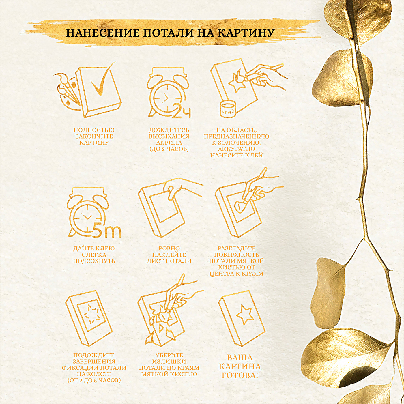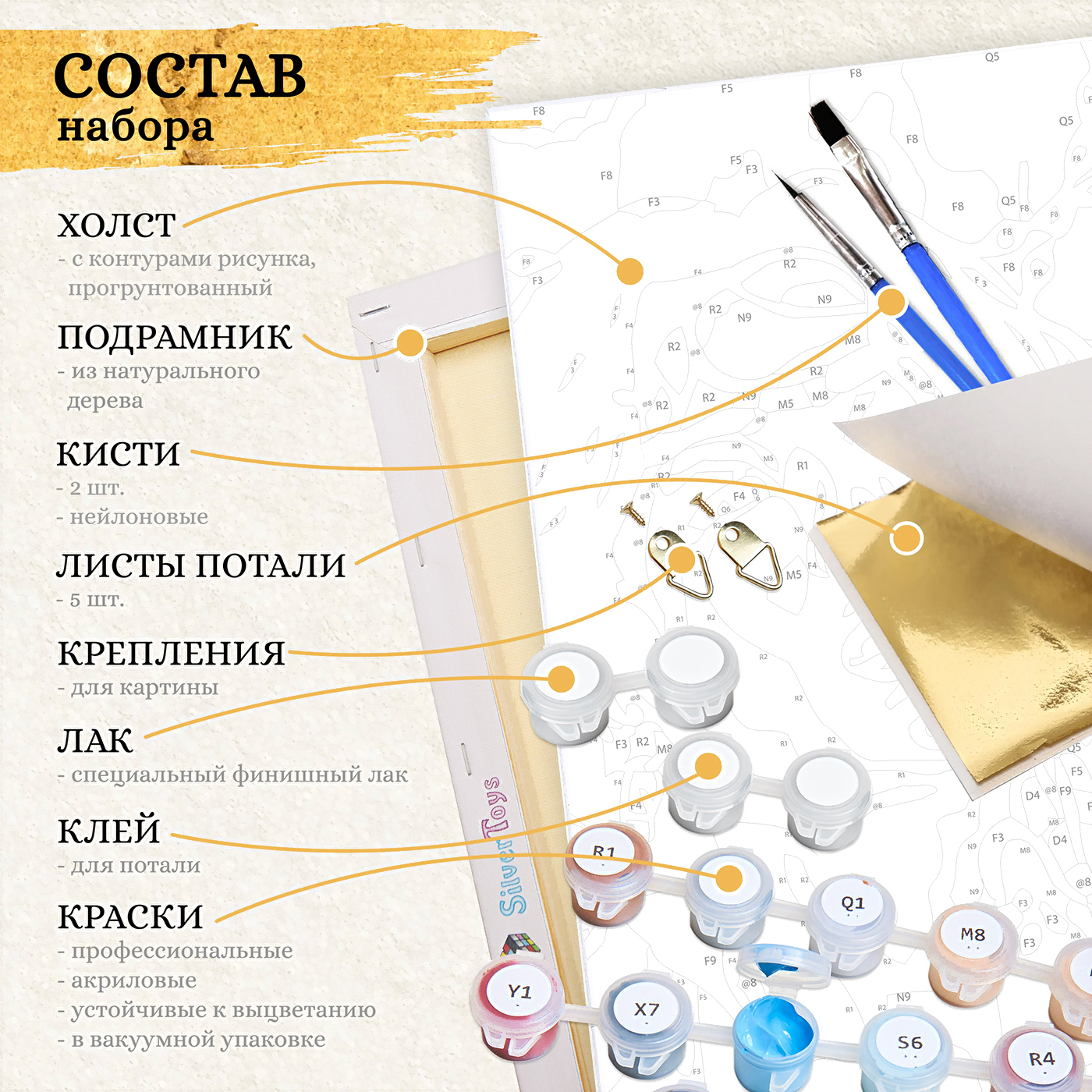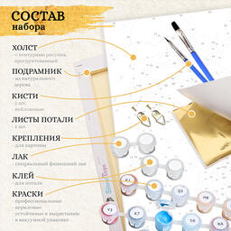 • Комплектация набора холст, крепление, краски, кисти (2 шт.), объемные элементы (поталь), лак