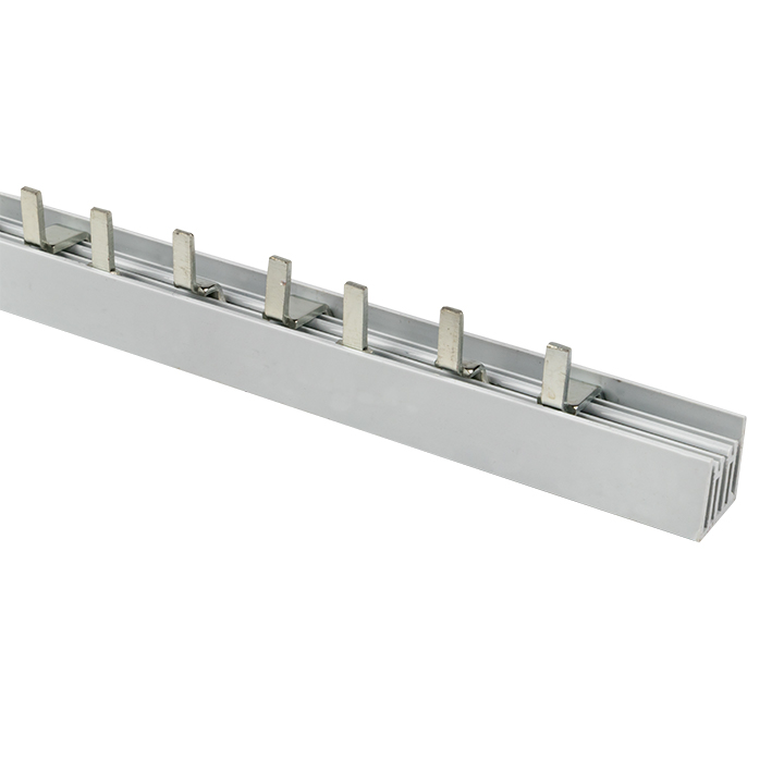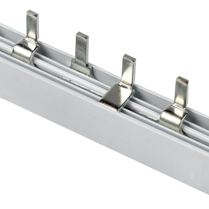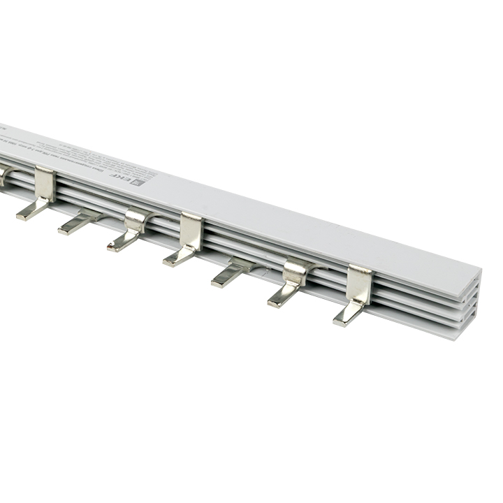 Шины соединительные производятся в двух исполнениях: FORK («вилка») и PIN («гребенка») на номинальные токи 63 и 100 А, на одно-, двух-,трех- и четырехфазную нагрузку. Шины соединительные представляют собой пластины, выполненные из меди (шины на 100 А – из луженой меди), закрепленные в корпусе из диэлектрического материала, не поддерживающего горение, и выпускаются стандартной длиной 1 метр.