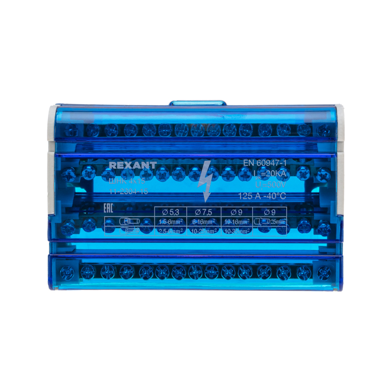 Изолированная шина на DIN-рейку REXANT применяется при комплектации щитового оборудования для подсоединения нулевого провода, провода заземления и фазных проводников. Изолирующая задняя панель и защитная крышка изделия из высококачественного самозатухающего пластика. Контактная часть шины выполнена из электротехнической латуни. Универсальное надежное крепление позволяет установить шину как на монтажную панель, так и на DIN-рейку.Технические характеристики:Поперечное сечение гибкого проводника (многопроволочного) с кабельным наконечником: 1,5-16 мм² Поперечное сечение жесткого проводника (одно-/многопроволочного): 2,5-35 мм² Тип крепления: винт М5Номинальный ток: 125 АНоминальное рабочее напряжение: 400 ВКоличество шин: 4Количество вводов: 15 Температура эксплуатации: -25...+40 ℃
