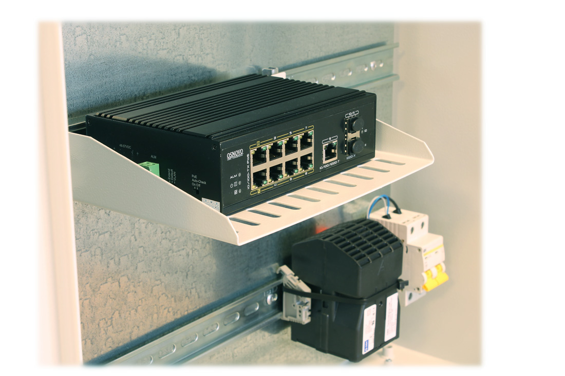 Для уличных станций всех типов и размеров. Ширина полки 255мм, Глубина 147мм. Установка на монтажную панель уличной станции или на DIN-рейку.