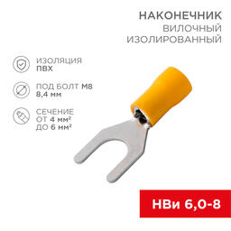 Наконечник вилочный изолированный (НВИ - 8.4 мм) 4-6 мм² REXANT предназначен для создания качественного подключения электрооборудования, которое при необходимости возможно разъединять без полного откручивания крепежного соединения, всего лишь ослабив винтовую фиксацию. Такая клемма используется для оконцовывания многожильных медных проводов при монтаже мобильных электрических контактных соединений на подвижном составе (автомобиле-, вагоно-, самолето- и судостроении) или в других местах, где важна надежность соединения (к примеру, телефонное или климатическое оборудование). Изолированный вилочный наконечник REXANT состоит из двух компонентов: металлического коннектора (вилка) и защитного изолятора, закрывающего место обжима. Металлический коннектор изготовлен из латуни, с поверхностным электролитическим лужением (возможно использование в условиях повышенной влажности), а изолятор клеммы из поливинилхлорида (ПВХ), который надежно защищает место обжима кабеля. Температурный диапазон: -10...+75 ℃. Обжатие производится специальными пресс-клещами (ht-301 H арт.12-3014, 12-3014; ht-301 N арт.12-3117, 12-3016, 12-3016-4; ht-301 W арт.12-3021, 12-3021-4, 12-3121) поверх защитного изолятора. Данная клемма применима для проводов с сечением в диапазоне 4-6 мм². Рабочая ширина штекера d2 = 8.4 мм. Цвет изолятора желтый. Максимально допустимая величина пропускаемого тока 48 А. Применение вилочных изолированных наконечников дает возможность существенно ускорять электромонтажные работы, при этом провода многократно отсоединяются и присоединяются к оборудованию.