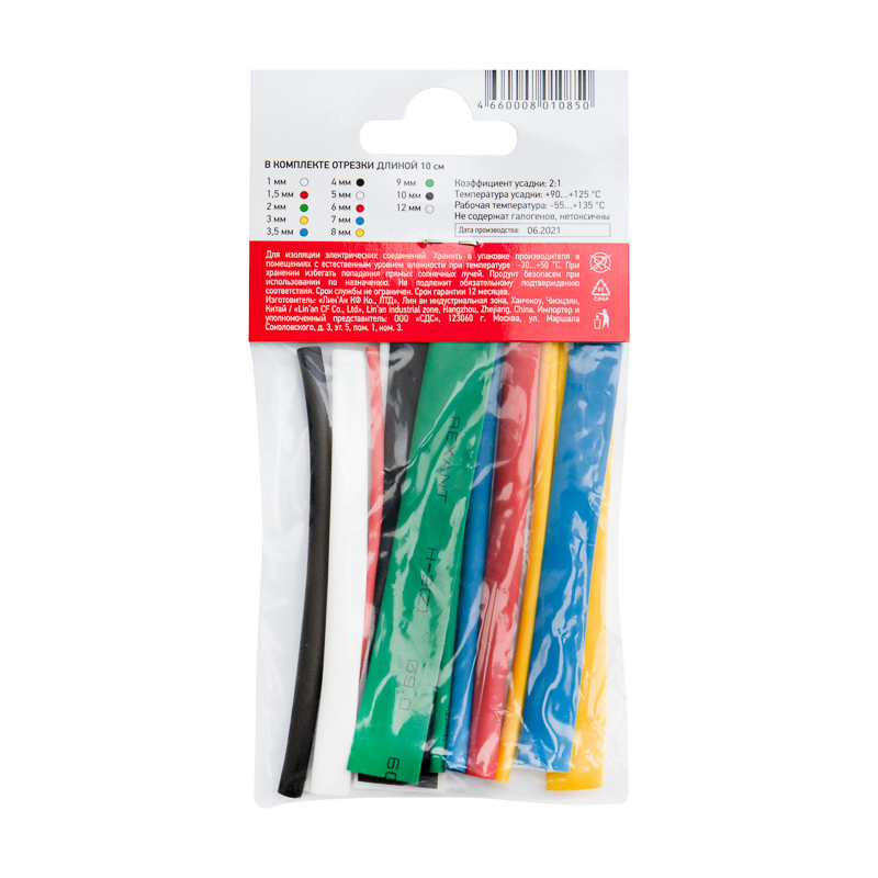 Термоусаживаемые трубки MULTICOLOR 2:1 REXANT оптимально подобран для использования в любых ситуациях.Назначение: для восстановления поврежденной и создания новой изоляции, герметизации поверхностей электрических соединений кабелей и проводов, бандажирования и маркировки проводов, для создания антикоррозийных защитных и декоративных покрытий.Состав набора: 1мм – 1шт(белый)1,5мм – 1шт(красный)2 мм – 1 шт(зеленый)3мм – 1шт(желтый)3,5мм – 1шт(синий)4мм – 1шт(черный)5мм – 1шт(белый)6мм – 1шт(красный)7мм – 1шт(синий)8мм – 1шт(желтый)9 мм – 1шт(зеленый)10 мм – 1шт(черный) 12 мм – 1шт(белый) 1. Длина: 10 см.2. Коэффициент усадки 2:1.3. Температура усадки: +90°С…+125°С4. Рабочая температура: -55°…+135°С5. Не содержет галогенов6. Нетоксично Отличается высокой гибкостью; материал(полиолефин), из которого изготовлена трубка, экологически безопасен. Уникальным свойством термоусаживаемых трубок является их способность менять свой диаметр, сжиматься в результате нагрева и принимать форму предмета или материала, на который совершается усадка, для этого достаточно нагреть трубку до необходимой температуры, а потом дать остыть. Трубка имеет свойство подавления горения, то есть она неспособна поддерживать горение, в отсутствии открытого огня затухает самостоятельно и неспособна воспламеняться.Рекомендуется проведение работ по усадке трубок с помощью специальных электромонтажных фенов и газовых горелок REXANT.
