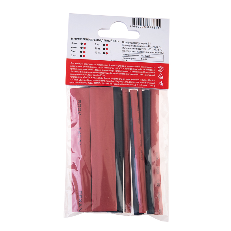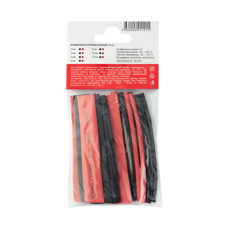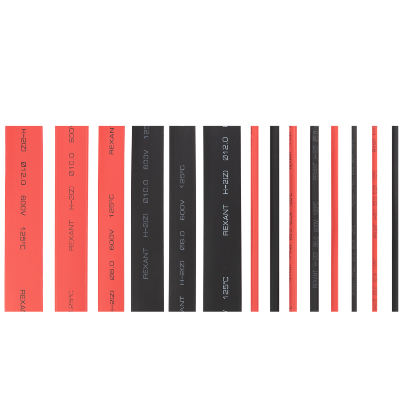Термоусаживаемые трубки MAXIMUM 2:1 REXANT оптимально подобран для использования в любых ситуациях.Назначение: для восстановления поврежденной и создания новой изоляции, герметизации поверхностей электрических соединений кабелей и проводов, бандажирования и маркировки проводов, для создания антикоррозийных защитных и декоративных покрытийСостав набора: 3мм – 2шт(красный, черный)4мм – 2шт(красный, черный)5мм – 2шт(красный, черный)6мм – 2шт(красный, черный)8 мм – 2шт(красный, черный)10 мм – 2 шт(красный, черный)12 мм – 2 шт(красный, черный)1. Длина: 10 см.2. Коэффициент усадки 2:1.3. Температура усадки: +90°С…+125°С4. Рабочая температура: -55°…+135°С5. Не содержет галогенов6. Нетоксично Отличается высокой гибкостью; материал(полиолефин), из которого изготовлена трубка, экологически безопасен. Уникальным свойством термоусаживаемых трубок является их способность менять свой диаметр, сжиматься в результате нагрева и принимать форму предмета или материала, на который совершается усадка, для этого достаточно нагреть трубку до необходимой температуры, а потом дать остыть. Трубка имеет свойство подавления горения, то есть она неспособна поддерживать горение, в отсутствии открытого огня затухает самостоятельно и неспособна воспламеняться.Рекомендуется проведение работ по усадке трубок с помощью специальных электромонтажных фенов и газовых горелок REXANT.