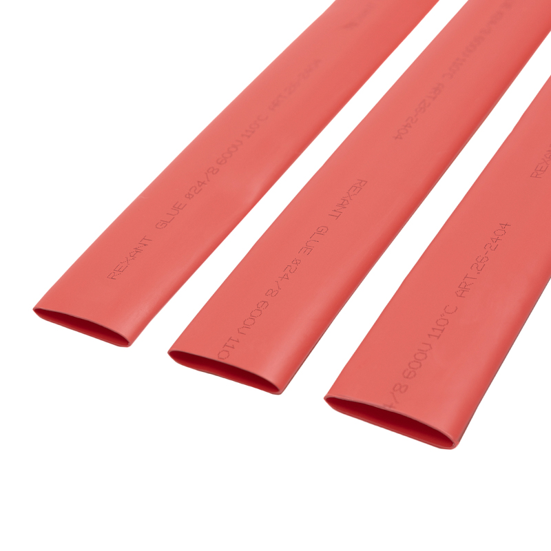 Термоусаживаемая трубка с клеевым слоем REXANT — один из самых популярных и надежных термоусаживаемых материалов.Предназначена для восстановления поврежденной и создания новой изоляции, герметизации поверхностей и электрических соединений кабелей и проводов, бандажирования и маркировки проводов, для создания антикоррозийных защитных и декоративных покрытий.Технические характеристики:1. Относительное удлинение при разрыве: не менее 200 %2. Температура усадки: +100 °С3. Температурный диапазон в режиме эксплуатации: -55...+110 °С4. Прочность на растяжение: не менее 10.4 МПа5. Электрическая прочность: не менее 19.7 кВ/мм6. Рабочее напряжение: 600 В7. Удельное электрическое сопротивление: 10^14 Ом/см8. Коэффициент усадки: 3:19. Не поддерживает горение10. Диаметр трубки до усадки: 24 мм11. Диаметр трубки после усадки: 8,5 мм12. Толщина трубки после усадки: 2,1 мм13. Клеевой слой: по всей длине на внутренней сторонеНа внутреннюю поверхность такой термоусаживаемой трубки нанесен клеевой слой. При нагреве клей расплавляется заполняя пустоты, обеспечивая герметичность и склейку места стыка с объектом воздействия. Уникальным свойством термоусаживаемых трубок является их способность менять свой диаметр, сжиматься в результате нагрева и принимать форму предмета или материала, на который совершается усадка, для этого достаточно нагреть трубку до необходимой температуры, а потом дать остыть. Трубка имеет свойство подавления горения, то есть она неспособна поддерживать горение, в отсутствии открытого огня затухает самостоятельно и неспособна воспламеняться.Рекомендуется проведение работ по усадке трубок с помощью специальных электромонтажных фенов и газовых горелок REXANT.