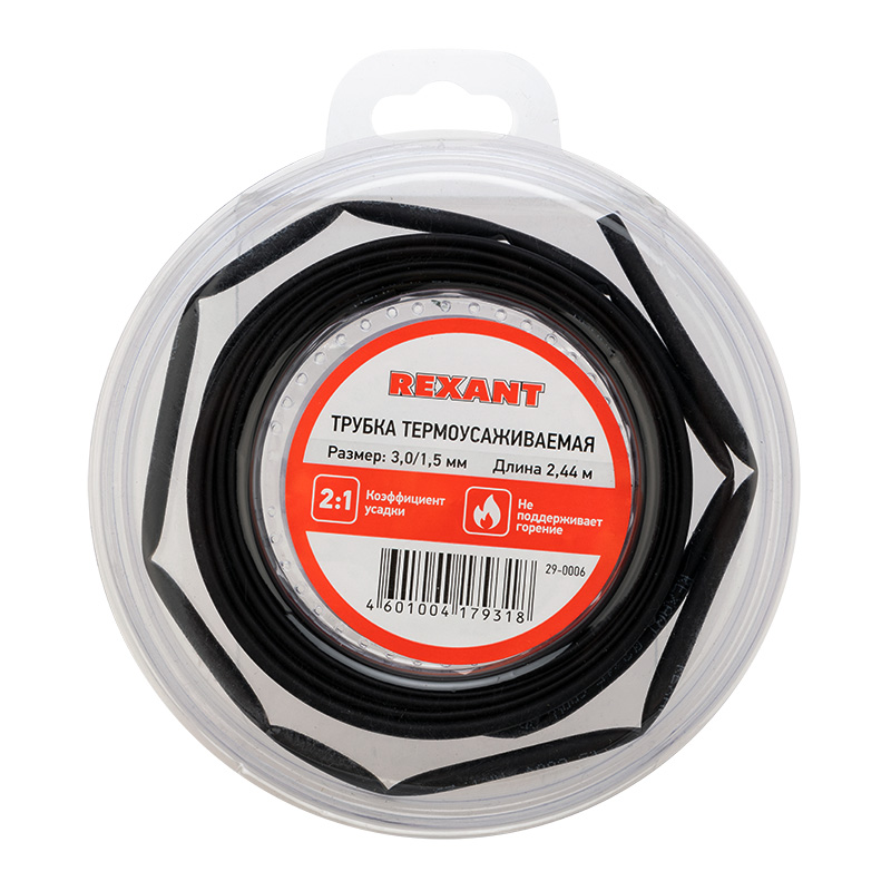 Термоусаживаемая трубка REXANT — один из самых популярных и надежных термоусаживаемых материалов.Предназначена для восстановления поврежденной и создания новой изоляции, герметизации поверхностей и электрических соединений кабелей и проводов, бандажирования и маркировки проводов, для создания антикоррозийных защитных и декоративных покрытий.Технические характеристики:1. Горючесть: не поддерживает горение2. Относительное удлинение при разрыве: не менее 200 %3. Температура усадки:110 ℃4. Температурный диапазон в режиме эксплуатации: -40...+125 ℃5. Прочность на растяжение: не менее 10.4 МПа6. Электрическая прочность: не менее 19.7 кВ/мм7. Рабочее напряжение: 600 В8. Удельное электрическое сопротивление: 10^14 Ом/см9. Диаметр трубки до усадки: 3,0 мм10. Диаметр трубки после усадки: 1,5 мм11. Толщина трубки после усадки: 0,4 мм12. Состав: ПолиолефинОтличается высокой гибкостью; материал(полиолефин), из которого изготовлена трубка, экологически безопасен. Уникальным свойством термоусаживаемых трубок является их способность менять свой диаметр, сжиматься в результате нагрева и принимать форму предмета или материала, на который совершается усадка, для этого достаточно нагреть трубку до необходимой температуры, а потом дать остыть. Трубка имеет свойство подавления горения, то есть она неспособна поддерживать горение, в отсутствии открытого огня затухает самостоятельно и неспособна воспламеняться.Рекомендуется проведение работ по усадке трубок с помощью специальных электромонтажных фенов и газовых горелок REXANT.