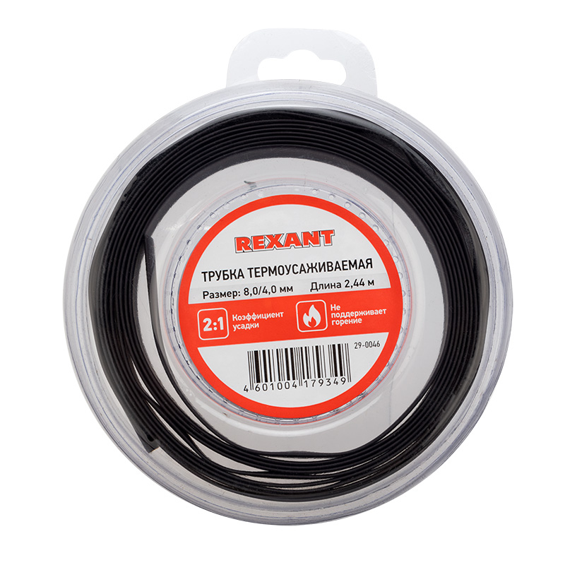 Термоусаживаемая трубка REXANT — один из самых популярных и надежных термоусаживаемых материалов.Предназначена для восстановления поврежденной и создания новой изоляции, герметизации поверхностей и электрических соединений кабелей и проводов, бандажирования и маркировки проводов, для создания антикоррозийных защитных и декоративных покрытий.Технические характеристики:1. Горючесть: не поддерживает горение2. Относительное удлинение при разрыве: не менее 200 %3. Температура усадки:110 ℃4. Температурный диапазон в режиме эксплуатации: -40...+125 ℃5. Прочность на растяжение: не менее 10.4 МПа6. Электрическая прочность: не менее 19.7 кВ/мм7. Рабочее напряжение: 600 В8. Удельное электрическое сопротивление: 10^14 Ом/см9. Диаметр трубки до усадки: 8,0 мм10. Диаметр трубки после усадки: 4,0 мм11. Толщина трубки после усадки: 0,6 мм12. Состав: ПолиолефинОтличается высокой гибкостью; материал(полиолефин), из которого изготовлена трубка, экологически безопасен. Уникальным свойством термоусаживаемых трубок является их способность менять свой диаметр, сжиматься в результате нагрева и принимать форму предмета или материала, на который совершается усадка, для этого достаточно нагреть трубку до необходимой температуры, а потом дать остыть. Трубка имеет свойство подавления горения, то есть она неспособна поддерживать горение, в отсутствии открытого огня затухает самостоятельно и неспособна воспламеняться.Рекомендуется проведение работ по усадке трубок с помощью специальных электромонтажных фенов и газовых горелок REXANT.