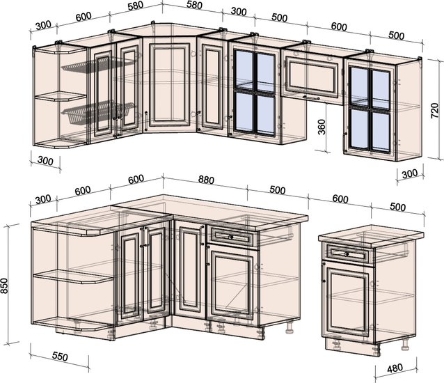 • Глубина нижних шкафов 55 см