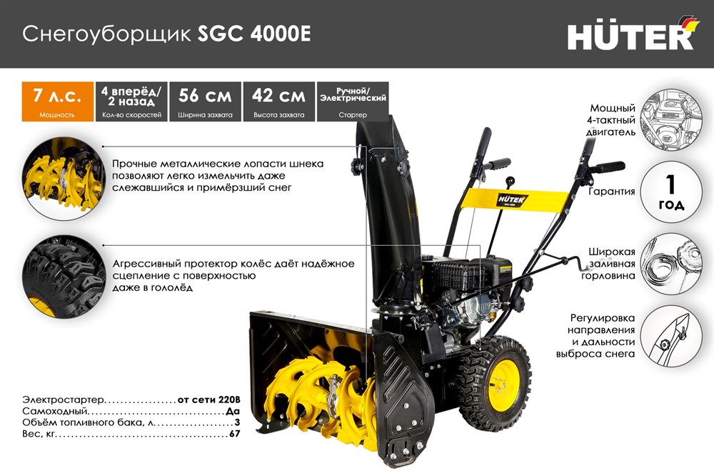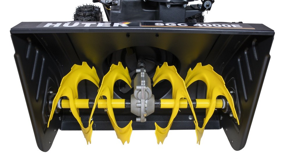 Снегоуборщик Huter SGC 4000E предназначен для расчистки небольших территорий от снега. Самоходная модель оснащена 4-тактным бензиновым двигателем мощностью 7 л.с. Ширина захвата за один проход составляет 56 сантиметров, шнек с зубцами измельчает плотный снег. Благодаря глубокому протектору колеса не скользят при гололеде, обеспечивая хорошую проходимость машины. Поворот желоба регулируется специальным рычагом. Отличие данной модели - наличие электростартера.