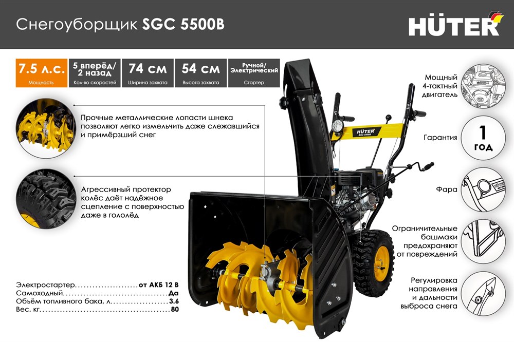 Снегоуборщик Huter SGC 5500B предназначен для расчистки небольших территорий от снега. Самоходная модель оснащена 4-тактным бензиновым двигателем мощностью 7,5 л.с. Ширина захвата за один проход составляет 74 сантиметра, шнек с зубцами измельчает плотный снег. Благодаря глубокому протектору колеса не скользят при гололеде, обеспечивая хорошую проходимость машины. Поворот желоба регулируется специальным рычагом.