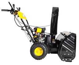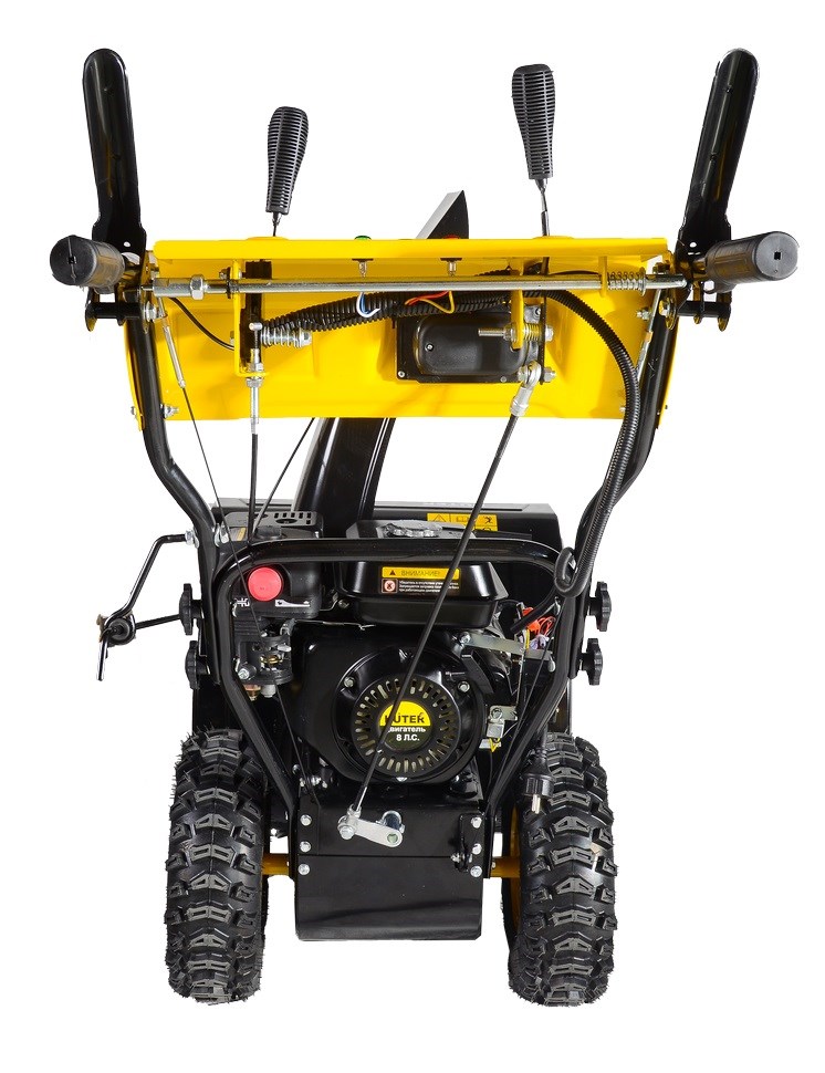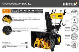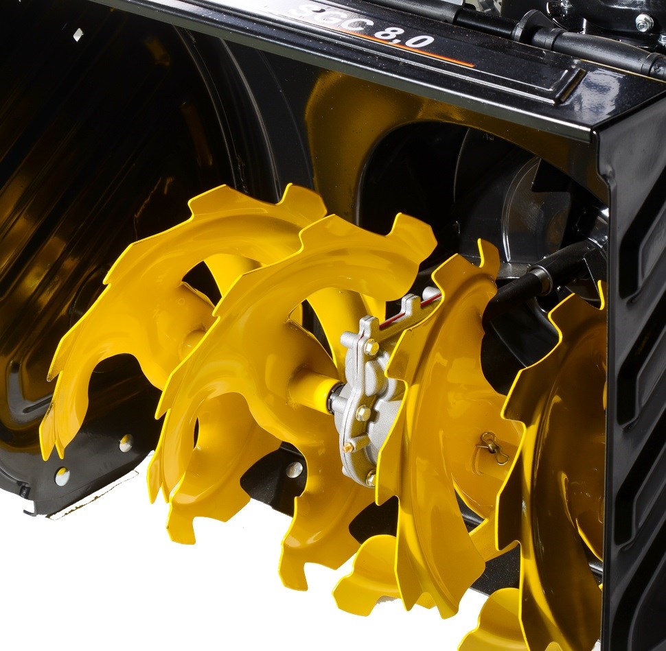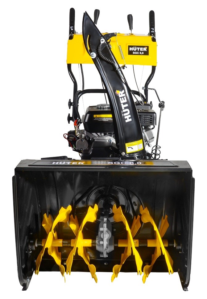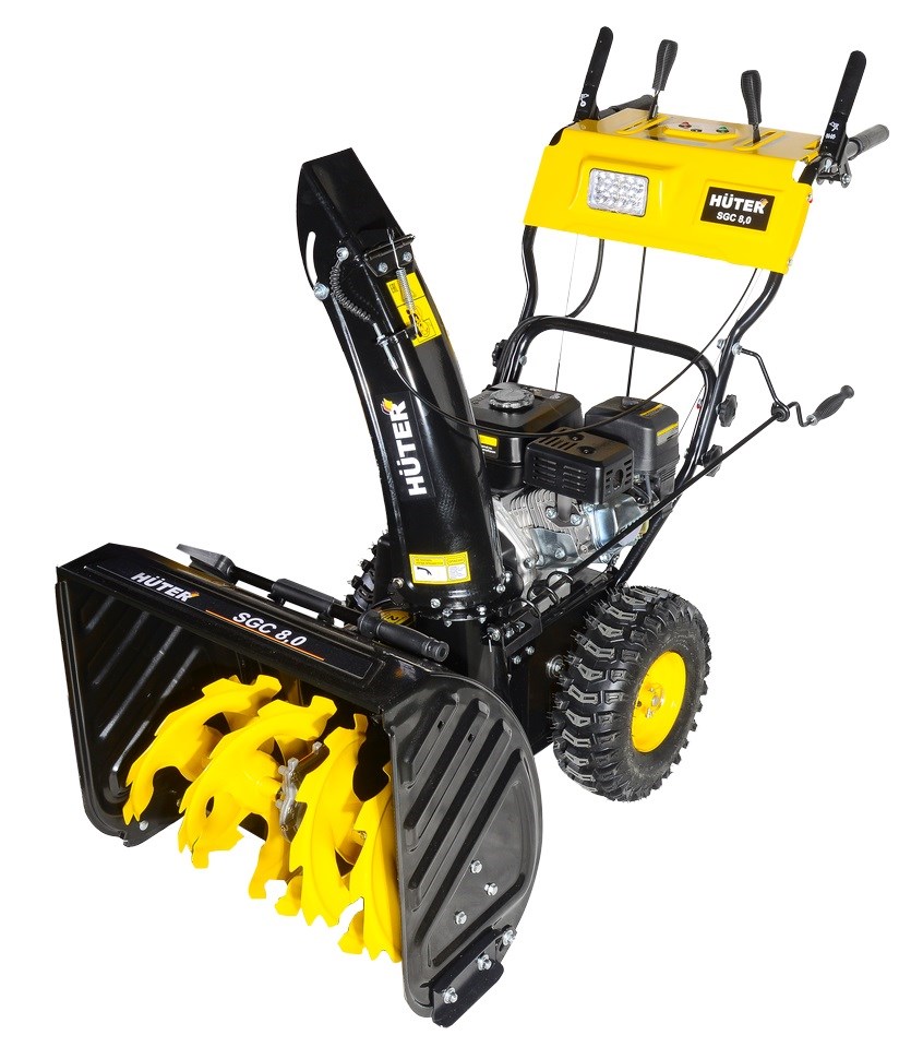 Снегоуборщик Huter SGC 8,0 – станет оптимальным выбором для дачного участка, парковой зоны, гаражного кооператива, паркинга. Для удобства включения агрегата модель оснащена электростартером, в случае необходимости можно пользоваться ручным стартером. Во время движения установки снег захватывается ковшом шириной 62 см и передается шнеком на вентилятор, который отбрасывает его через желоб на расстояние до 15 м. Сторону выброса можно менять с помощью рукоятки. Шнек имеет зубчатую форму, а нижняя часть ковша оснащена механическими лыжами, это позволяет устройству легко справляться со слежавшимся, утрамбованным, заледеневшим слоем снега без риска повреждения поверхностей. Самоходный снегоуборщик установлен на мощные колеса с зимним протектором, исключающим проскальзывание. В конструкции предусмотрена возможность переключения скоростей: 6 вперед и 2 назад. Для удобства работы модель оснащена ручками с подогревом и фарой.