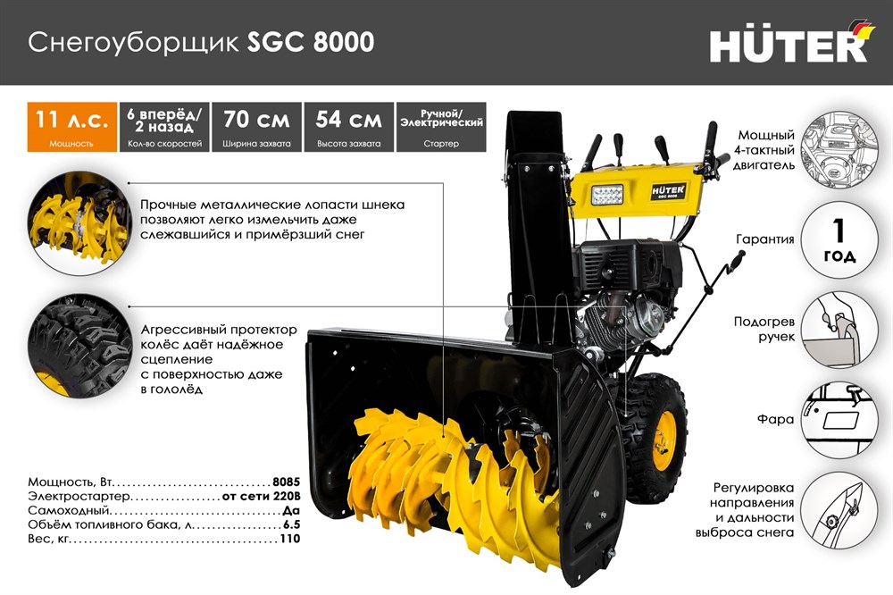 Снегоуборщик Huter SGC 8000 предназначен для расчистки небольших территорий от снега. Самоходная модель оснащена 4-тактным бензиновым двигателем мощностью 11 л.с. Ширина захвата за один проход составляет 70 сантиметров, шнек с зубцами измельчает плотный снег. Благодаря глубокому протектору колеса не скользят при гололеде, обеспечивая хорошую проходимость машины. Поворот желоба регулируется специальным рычагом.