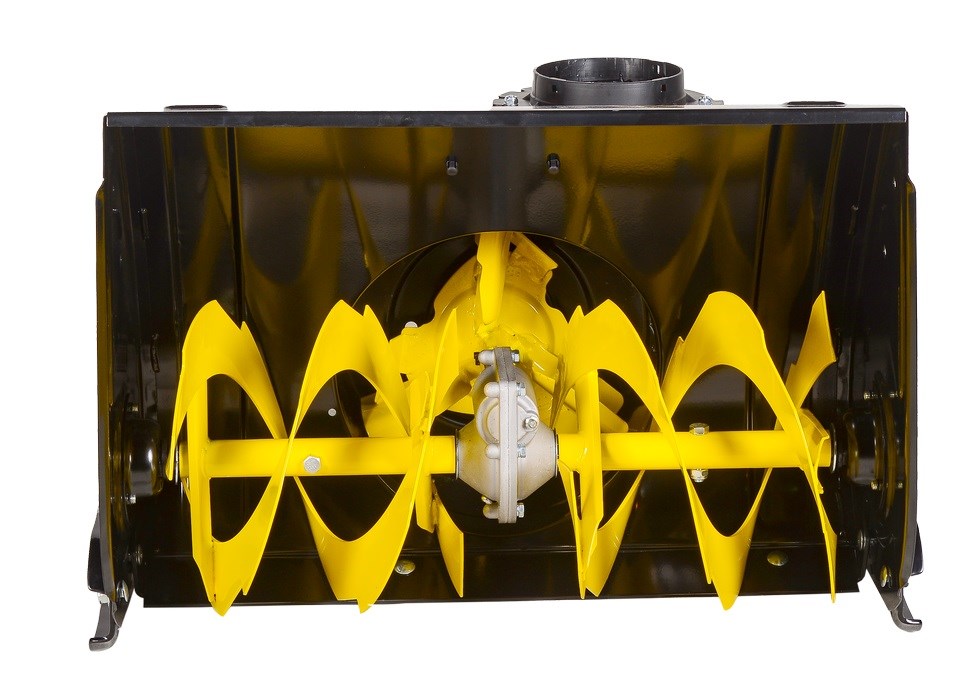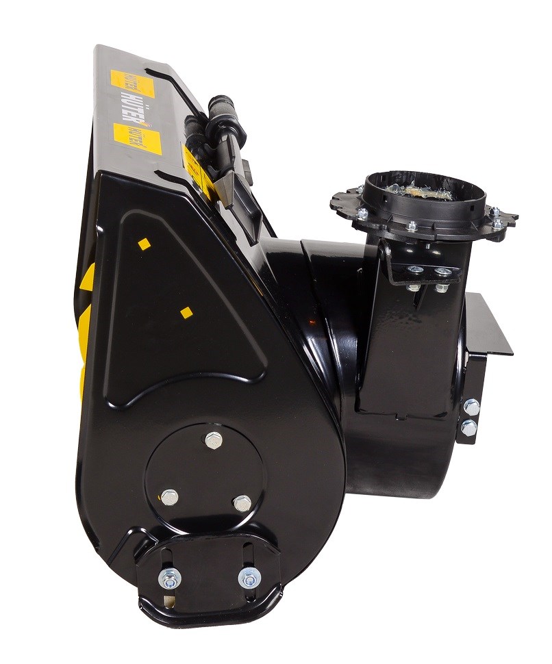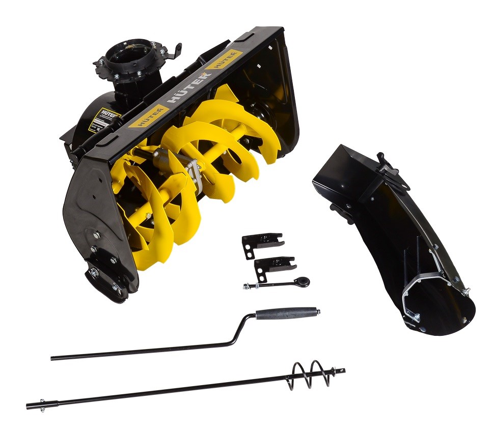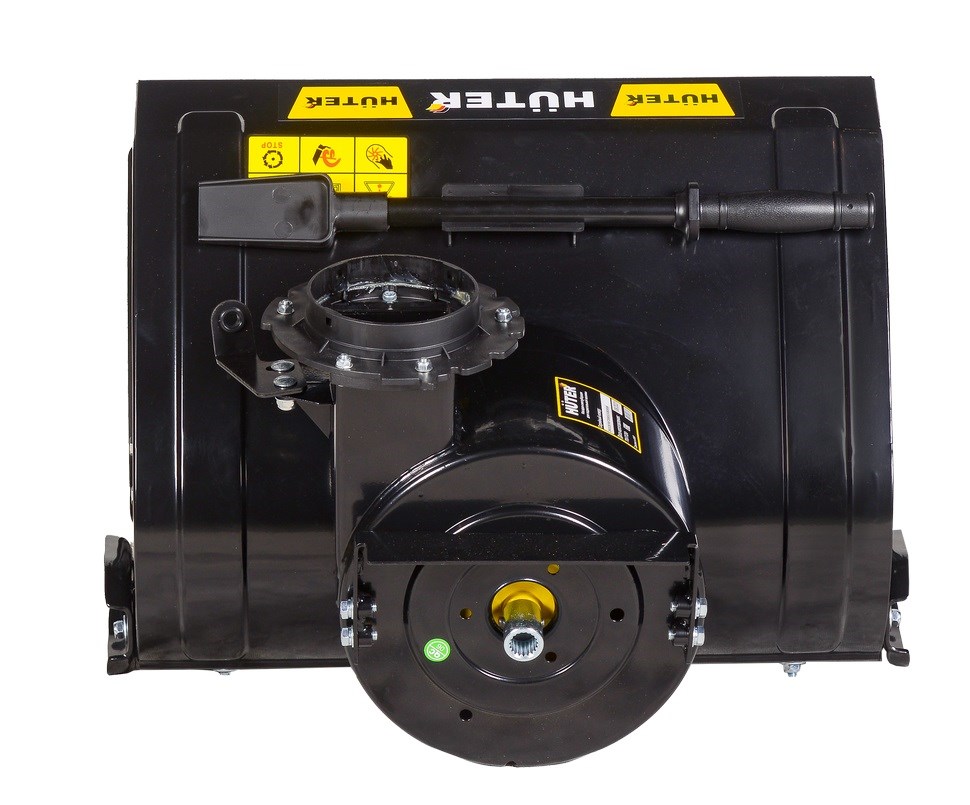 Насадка-снегоуборщик устанавливается на подметальную машину Huter SGC 4100S. Имеет ширину захвата 56 см и высоту 42 см. Состоит из ковша, металлического шнека и желоба для выброса снега. Направление желоба и высота выброса регулируется ручкой на желобе.