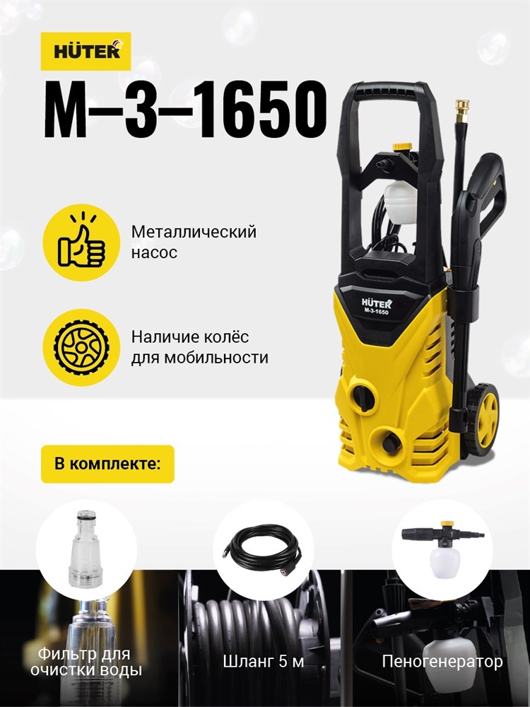 Мойка Huter M-3-1650 используется в быту для ухода за автомобилем, фасадами дома, дорожками и ограждениями. Забор воды осуществляется из емкости или водопроводной сети. Очистительный фильтр не пропускает загрязнения и примеси, обеспечивая длительный срок службы агрегата. Бытовой пеногенератор позволяет обработать поверхности активной пеной. Помпа выполнена из алюминия, не подверженного образованию коррозии.