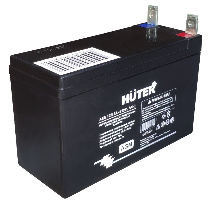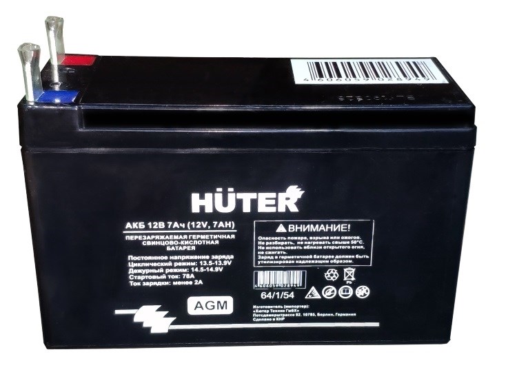 Аккумуляторная батарея Huter 12В 7А предназначена для запуска бензиновых электрогенераторов, оснащённых электрическим стартером. Могут применяться, так же, и для другой бензиновой техники со схожими техническими параметрами. Аккумуляторы Huter изготовлены при помощи технологии AGM (Absorbent Glass Mat), отличие батарей AGM от классических в том, что в них содержится абсорбированный электролит, а не жидкий, что даёт ряд преимуществ в свойствах аккумулятора. Данный аккумулятор продойдет для генераторов DY3000 и DY4000.