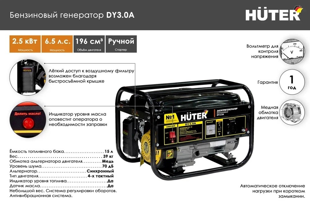 Бензиновый генератор Huter DY3.0A – предназначен для получения электроэнергии в тех местах, где отсутствует магистральное электроснабжение. Также может использоваться в качестве альтернативного источника энергии в случае отключения электрической энергии. Электрогенератор станет настоящим спасением для дачи и дома при частых перебоях с электричеством. Изделие оснащено одной розеткой 220 В, вольтметром и удобной индикацией уровня топлива и датчиком уровня масла. Часто применяется на строительных площадках для работы электроинструментов. Устройство отличается надежностью и качеством сборки.