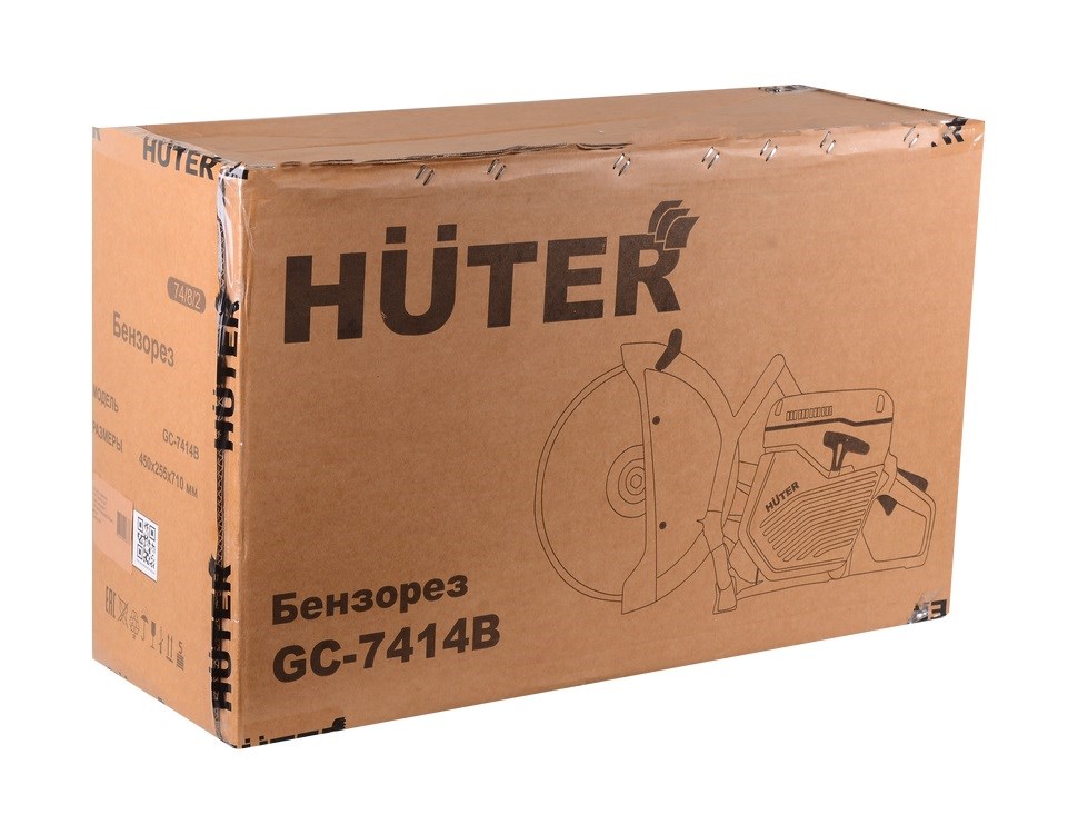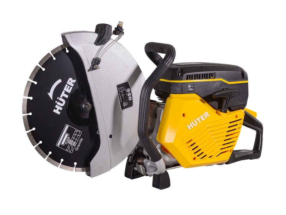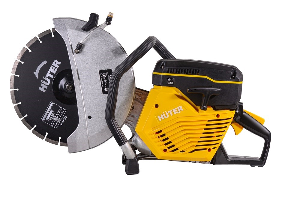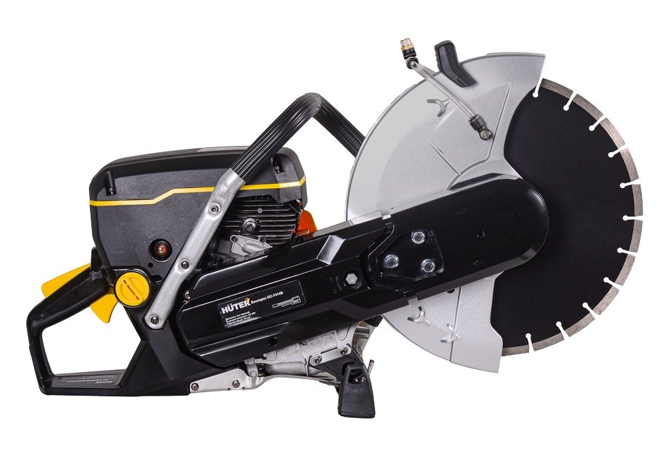 Бензорез Huter GC-7414B – предназначен для резки асфальтового покрытия, бетонных изделий, натурального и искусственного камня, кирпича, различных металлов и других твёрдых материалов. Рабочим органом бензореза является алмазный либо абразивный круг (диск) диаметром 350 мм с посадочным диаметром 20 или 25.4 мм. Максимальная глубина реза – 125 мм., максимальная частота оборотов диска составляет 4700 об/мин. В качестве силового агрегата используется карбюраторный 2-тактный двигатель объемом 74 см3, мощностью 3.5 кВт. с ременным приводом. Модель GC-7414B Huter оснащена двумя удобными рукоятками, защитным кожухом, глушителем и антивибрационной системой.