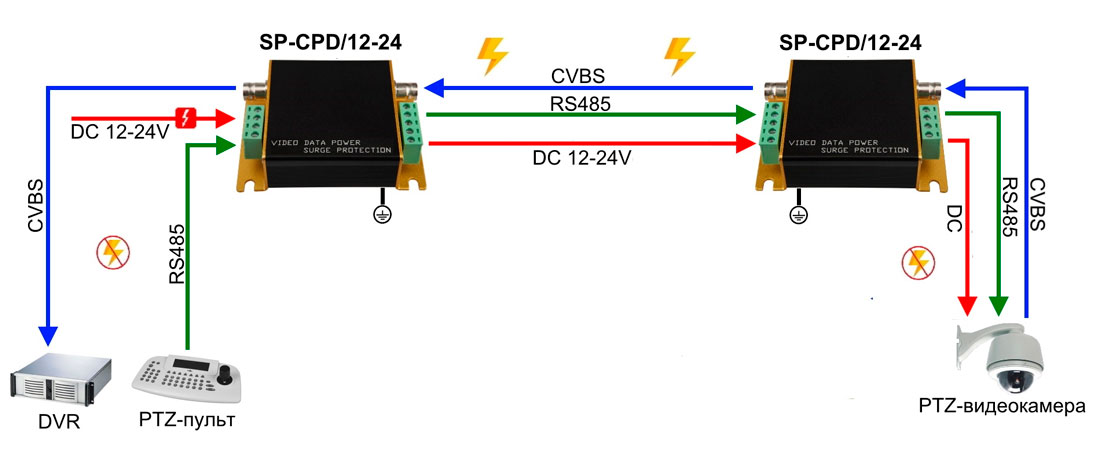Устройство грозозащиты цепей видео, питания и данных. Видео: 1 вход (BNC-мама), 1 выход (BNC-мама); Питание и данные: 1 вход (клеммы), 1 выход (клеммы). Две степени защиты. Цепь питания 12/24B. Размеры (ШxВxГ): 90x23x64мм.