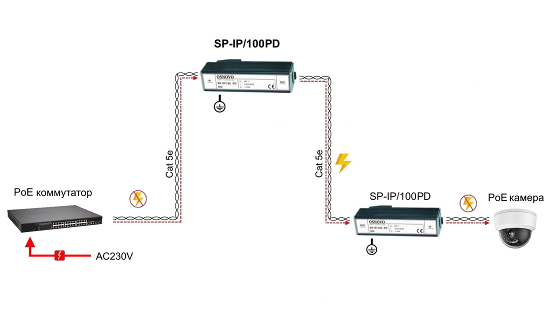 Устройство грозозащиты для локальной вычислительной сети (скорость до 100Мбит/с) с защитой линий PoE (af/at, метод B, контакты 4/5, 7/8), двухуровневая защита. 1 вход (RJ45-мама), 1 выход (RJ45-мама). Максимальное длительное рабочее напряжение (данные/питание) 7,5V/60V. Номинальный ток разряда (8/20мкс, In, данные/питание) 2kA/2,5kA. Суммарный ток разряда (8/20мкс, Itotal) 4kA. Время отклика для линии данных не более 1нс (линия-линия), не более 100нс (линия-земля); для линии PoE не более 25нс. Монтаж на DIN-рейку. Размеры (ШxВxГ): 25x104x25мм. Рабочая температура: -40…+80°С.