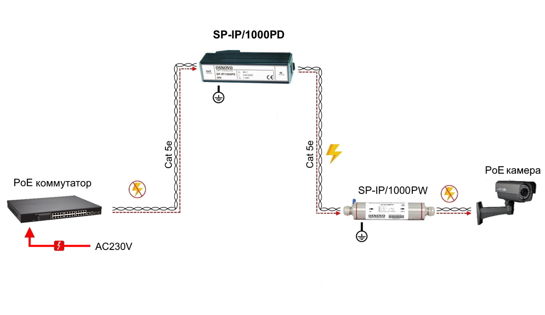 Устройство грозозащиты для локальной вычислительной сети (скорость до 1000 Мбит/с) с защитой линий PoE (af/at, методы A + B, контакты 1/2, 3/6, 4/5, 7/8). Двухступенчатая защита. Максимальное длительное рабочее напряжение (Uс) DC57V. Номинальный ток разряда (8/20 мкс, In) 2,5kA. Суммарный ток разряда (8/20 мкс, Itotal) 10kA. Время отклика 1нс. 1 вход (RJ45-мама), 1 выход (RJ45-мама). Монтаж на DIN-рейку. Размеры (ШхВхГ): 26x93,5x27мм. Рабочая температура: -40…+80°С.