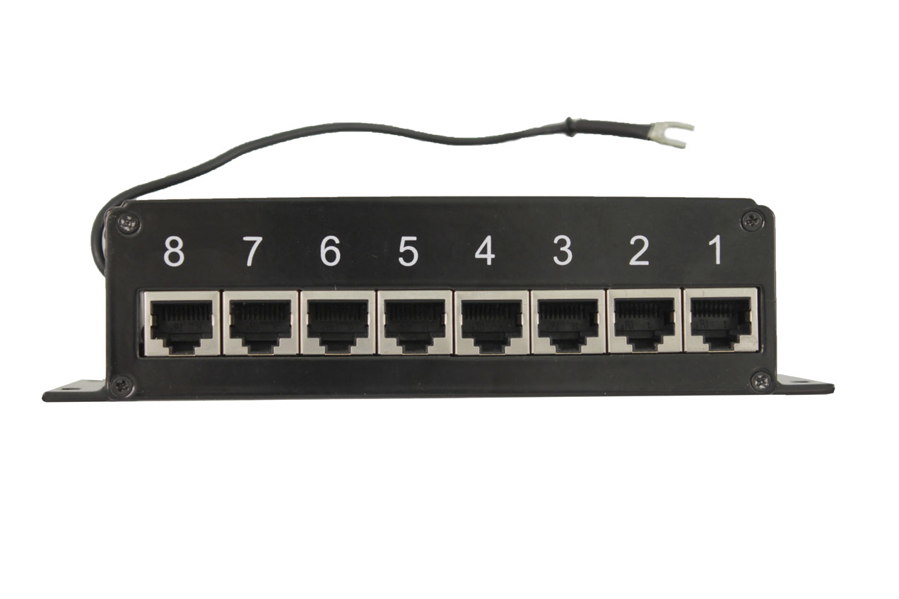 Устройство грозозащиты для локальной вычислительной сети (скорость до 1000 Мбит/с) на 8 портов. Двухступенчатая защита. Максимальное длительное рабочее напряжение (Uc) 6V. Номинальный ток разряда (8/20 мкс, In) 2,5kA. Суммарный ток разряда (8/20 мкс, Itotal) 5kA. Время отклика не более 10 нc. 8 входов (RJ45-мама), 8 выходов (RJ45-мама). Размеры (ШхВхГ): 168x42х75мм. Рабочая температура: -40…+80°С.