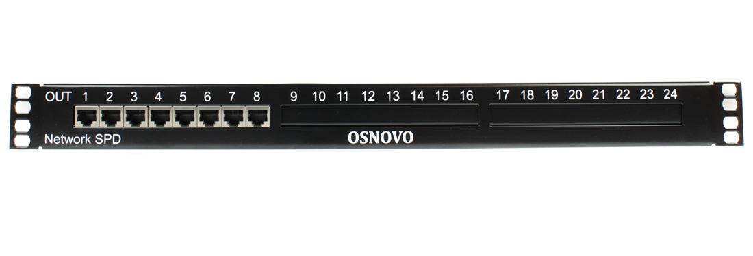 Устройство грозозащиты для локальной вычислительной сети (скорость до 1000 Мбит/с) на 8 портов. Двухступенчатая защита. Максимальное длительное рабочее напряжение (Uc) 6V. Номинальный ток разряда (8/20 мкс, In) 2,5kA. Суммарный ток разряда (8/20 мкс, Itotal) 20kA. Время отклика не более 1 нc. 8 входов (RJ45-мама), 8 выходов (RJ45-мама). Монтаж в 19" стойку (1U). Размеры (ШхВхГ): 487x44,5x102мм. Рабочая температура: -40…+80°С.