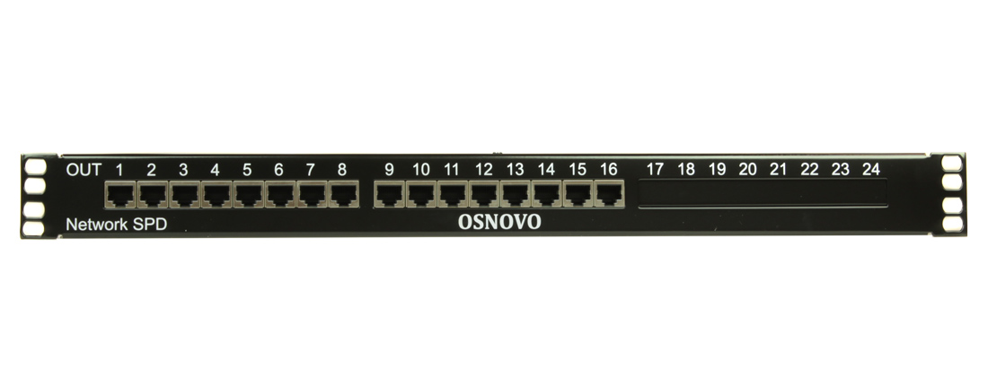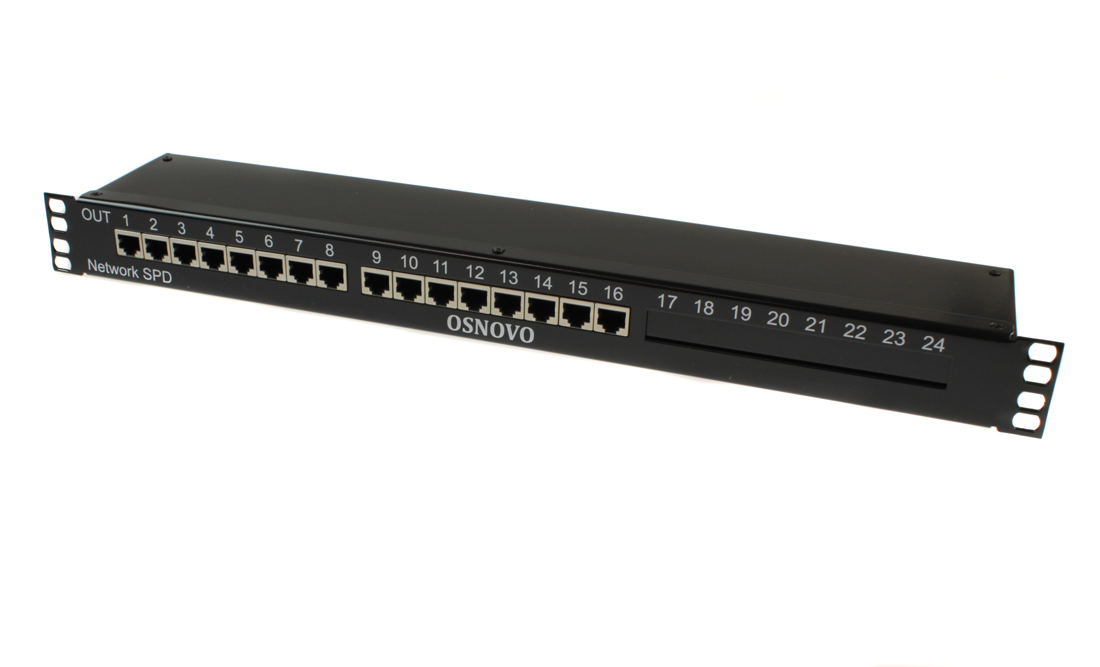 1U устройство грозозащиты для локальной вычислительной сети на 16 портов (скорость до 1000 Мб/с) с защитой линий PoE (af/at, методы A + B, контакты 1/2, 3/6, 4/5, 7/8). Двухступенчатая защита. Максимальное длительное рабочее напряжение (Uс) DC58V. Номинальный ток разряда (8/20 мкс, In) 2,5kA. Суммарный ток разряда (8/20 мкс, Itotal) 20kA. Время отклика 1нс. 16 входов (RJ45-мама), 16 выходов (RJ45-мама). Монтаж в 19" стойку (1U). Размеры (ШхВхГ): 487x44,5x102мм. Рабочая температура: -40…+80°С.