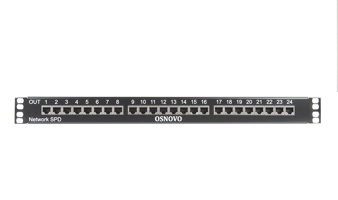 Устройство грозозащиты для локальной вычислительной сети (скорость до 100 Мбит/с) на 24 порта. Двухступенчатая защита. Максимальное длительное рабочее напряжение (Uc) 6V. Номинальный ток разряда (8/20 мкс, In) 2,5kA. Суммарный ток разряда (8/20 мкс, Itotal) 10kA. Время отклика не более 1 нc. 24 входов (RJ45-мама), 24 выходов (RJ45-мама). Монтаж в 19" стойку (1U). Размеры (ШхВхГ): 487x44,5x102мм. Рабочая температура: -40…+80°С.