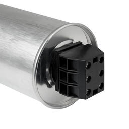 Конденсаторы изготавливаются на основе металлизированной самовосстанавливающейся полипропиленовой пленки с низким коэффициентом потерь, обеспечивающей высокие эксплуатационные характеристики. Три пленочных конденсатора устанавливаются в алюминиевый корпус цилиндрической формы и заливаются полиуретановой смолой с высоким коэффициентом теплоотвода, увеличивая, таким образом, срок службы конденсатора. Для защиты конденсаторов предусмотрена система отключения при избыточном давлении. Для безопасной работы в трехфазный конденсатор встроен разрядный резистор. Для подсоединения проводников предусмотрен соединитель в пластиковом кожухе. Возможна коммутация алюминиевым и медным проводом."