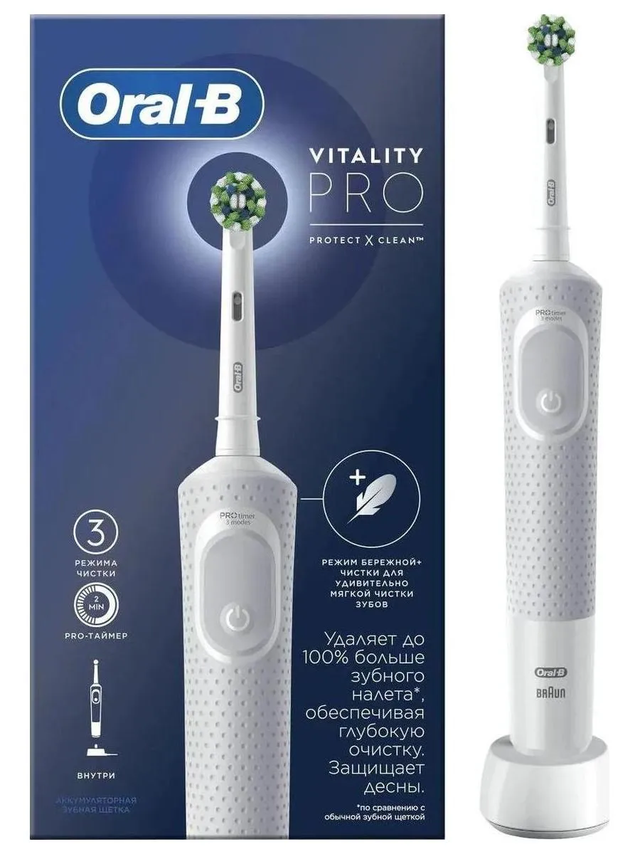 Электрическая зубная щетка Oral-B Vitality Pro станет прекрасным подарком для Вас и Ваших родных. Oral-B Vitality Pro понравится Даже любителям экстра бережного очищения благоДаря уникальному режиму SENSITIVE PLUS. Oral-B Vitality Pro уДаляет до 100% больше мягкого зубного налета по сравнению с обычной щеткой, а встроенный таймер оповестит вас о завершении 2-х минутной процедуры чистки.