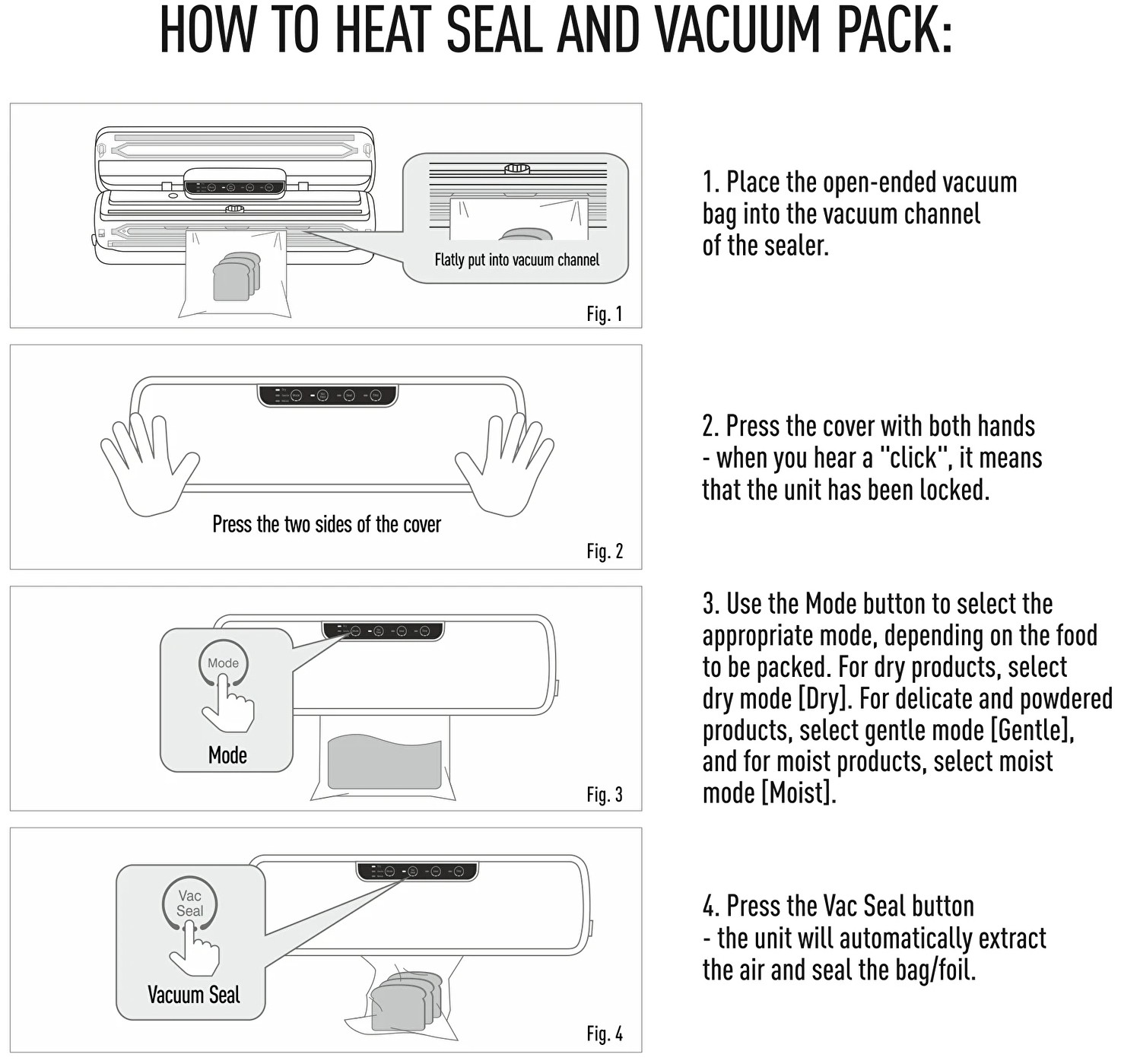 • Программы и режимы dry (сухие продукты)moist (влагосодержащие продукты)canister (вакуумирование контейнеров)