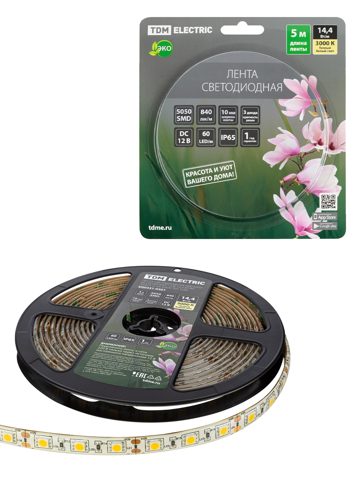Лента светодиодная SMD5050-60 LED/м-IP65-12 В-14,4 Вт/м-3000 К SQ0331-0361