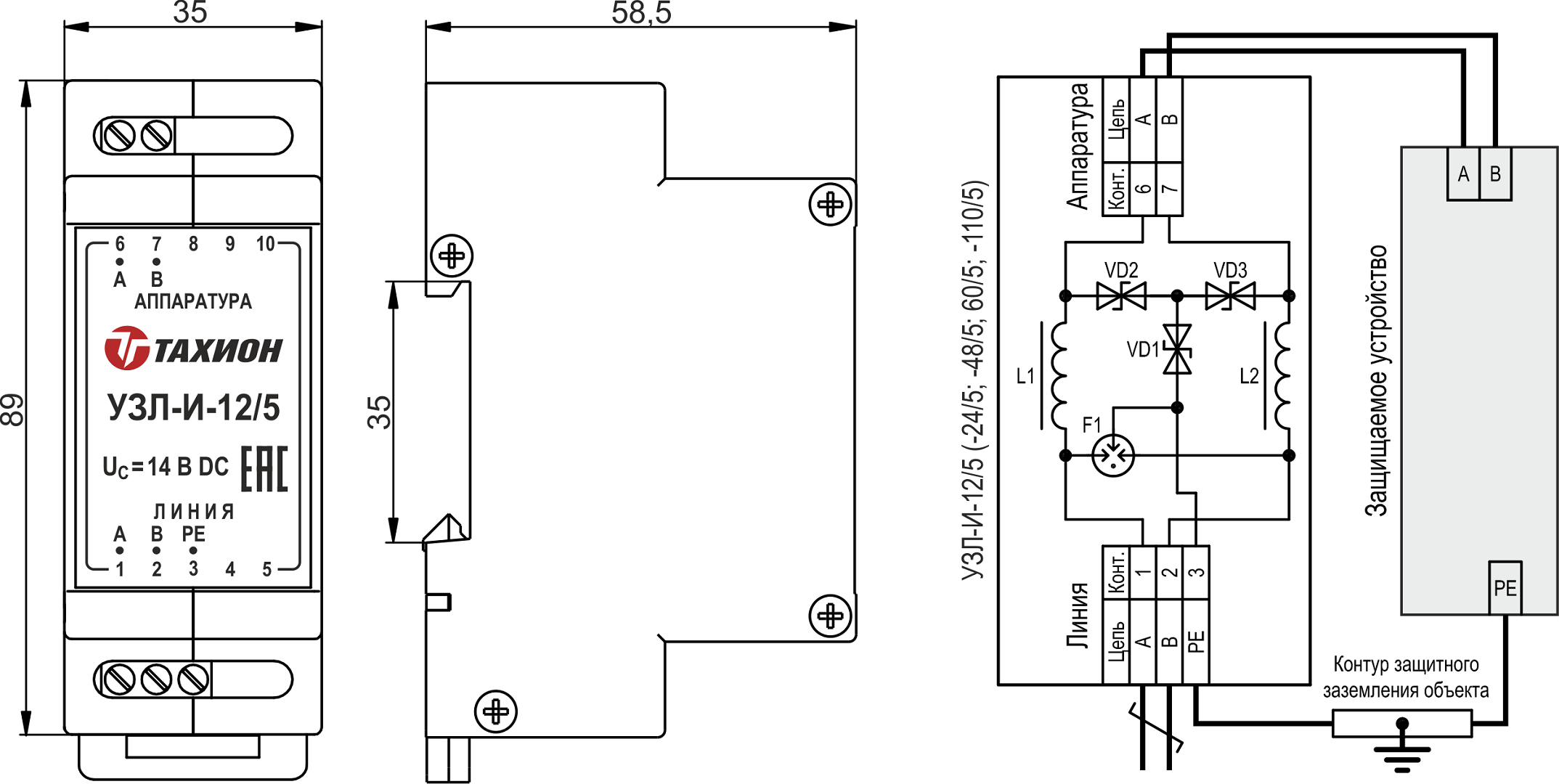 Устройство защиты интерфейсов с подачей питания УЗЛ-И-110/5 предназначено для защиты от импульсных перенапряжений (грозовых, электростатических разрядов и др.) оборудования промышленной автоматизации, диспетчеризации, систем безопасности, использующих 2х проводные линии интерфейса RS-485, RS-422, M-bus, CAN и их разновидностей, в пределах 2 ÷ 3 зон молниезащиты (в соответствии с МЭК 61312-1).