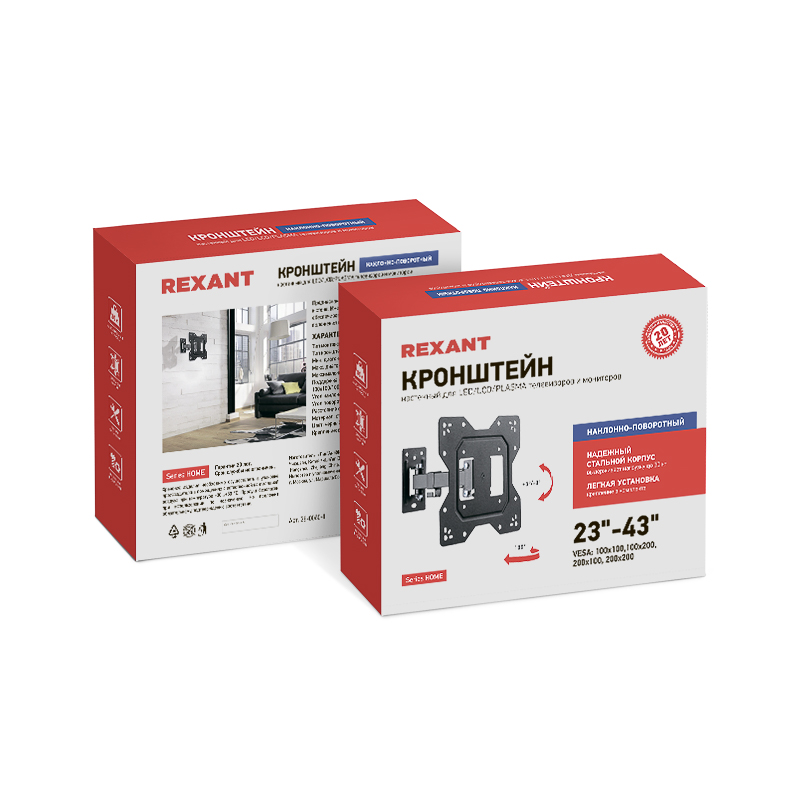 Кронштейн серии Home REXANT предназначен для крепления LED/LCD/PLASMA телевизоров 23"- 43" дюймов к стене. Оснащен наклонно-поворотным механизмом (с 1 коленом), который позволяет свободно регулировать положение телевизора, что обеспечивает комфортный и удобный просмотр вне зависимости от Вашего расположения в комнате. В любой момент телевизор можно повернуть в нужную Вам сторону, выставить необходимый угол наклона и избежать бликов при смене освещения. Конструкция механизма позволяет точно и надежно фиксировать заданное положение с максимальной точностью.