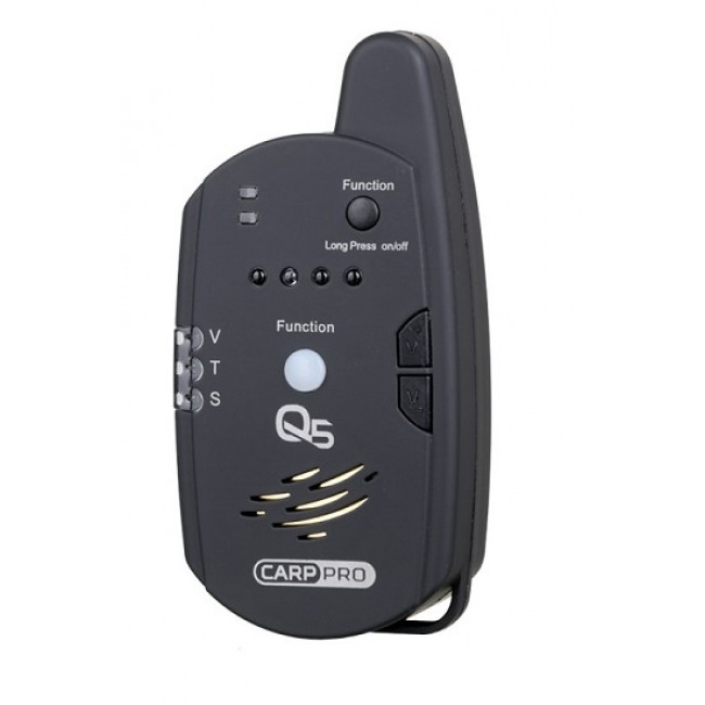 Carp Pro Q5 – наборы высококлассных электронных сигнализаторов поклевки. Поставляются в комплектах 4+1 (красный, синий, зеленый, желтый + ресивер). Прочный корпус сигнализатора поклевки выполнен из пластика, имеет влагозащиту и оборудован боковыми фиксаторами Snag Ears, которые не дают удилищу упасть при порывах бокового ветра и мощных боковых поклевках. Сигнализатор CarpPro Q5 выдает звук разной тональности при поклевках от берега и к берегу. Звук дублируется световой индикацией: бегущая дорожка светодиодов показывает направление поклевки. На корпусе установлены три ручки, которые регулируют тон, громкость звука, а также чувствительность сигнализатора. Во время вращения ручки упомянутый световой индикатор отображает установленный уровень громкости, тона, чувствительности – в зависимости от того, какую ручку вращать. На передней панели находится датчик освещенности, который в темное время суток включает ночной режим – подсветку центральной белой кнопки. Сигнализатор оборудован режимом «антивор»: если его включить, то при снятии удилища с сигнализатора включается громкий звуковой сигнал, сопровождающийся миганием подсветки. Ресивер показывает не только какой сигнализатор зафиксировал поклевку, но и в каком направлении эта поклевка произошла. С ресивера можно дистанционно менять громкость и тон звука, а также чувствительность на каждом из сигнализаторов. Вместо звукового сигнала, громкость которого регулируется, на ресивере можно включить вибросигнал.