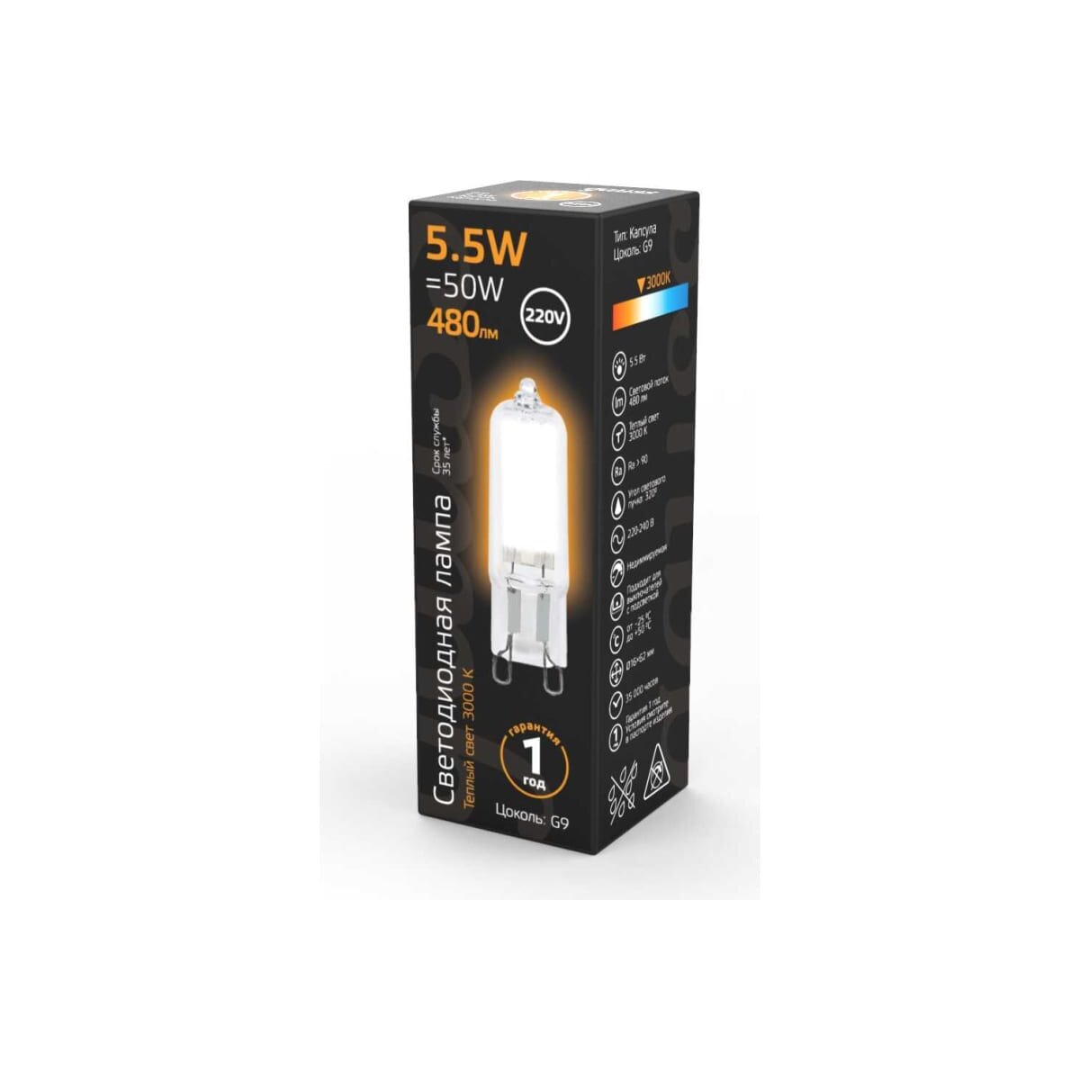 Лампа светодиодная Gauss 107809105 G9 5.5Вт G9 капсула 220B 3000K св.свечения белый теплый уп/10шт
