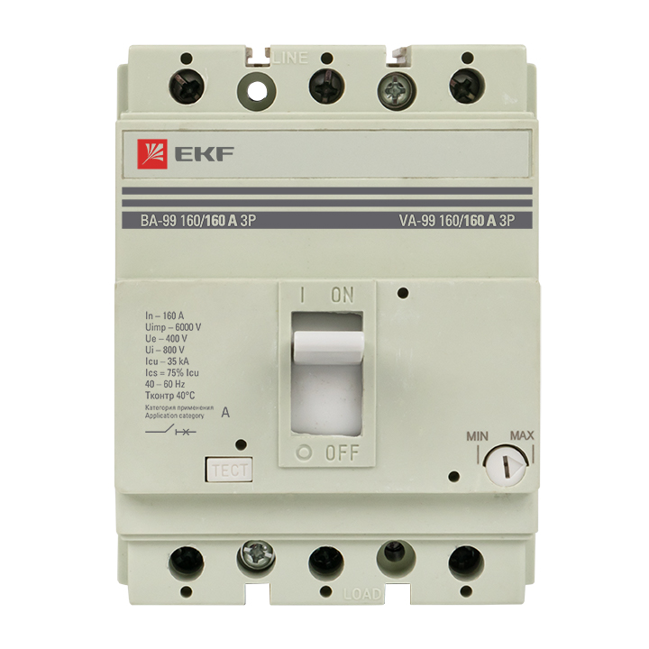 "Выключатель ВА-99 выполнен в виде моноблока и состоит из основания и крышки с фальшпанелью, в которой имеется окно для рукоятки управления и толкатель кнопки «Тест» - проверки механизма отключения выключателя.