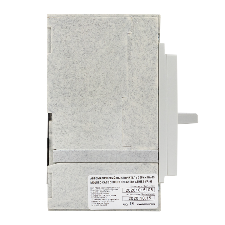 "Выключатель ВА-99 выполнен в виде моноблока и состоит из основания и крышки с фальшпанелью, в которой имеется окно для рукоятки управления и толкатель кнопки «Тест» - проверки механизма отключения выключателя.