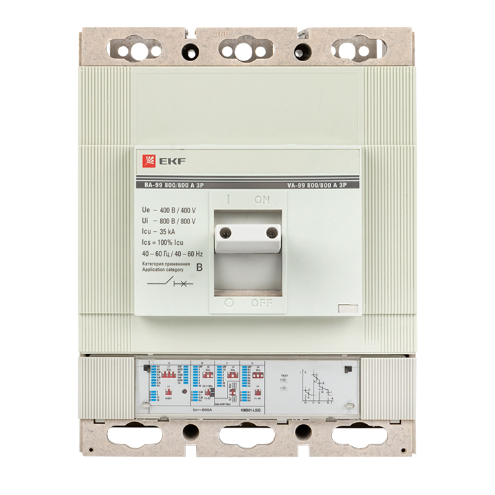 "Выключатель ВА-99 выполнен в виде моноблока и состоит из основания и крышки с фальшпанелью, в которой имеется окно для рукоятки управления и толкатель кнопки «Тест» - проверки механизма отключения выключателя.