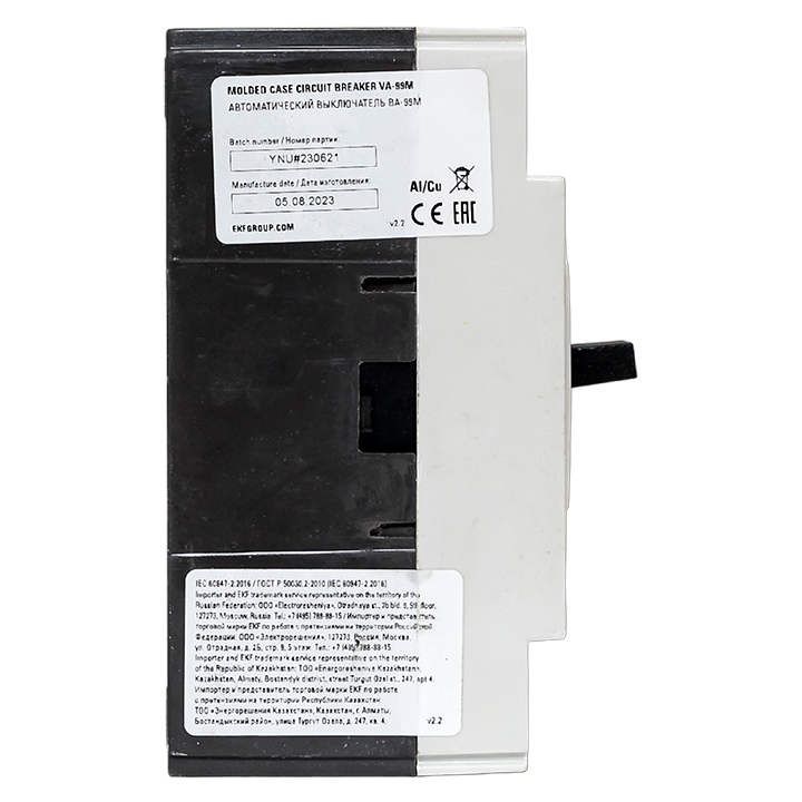 "Выключатель ВА-99М выполнен в виде моноблока и состоит из основания и крышки с фальшпанелью, в которой имеется окно для рукоятки управления и толкатель кнопки «Тест» - проверки механизма отключения выключателя.
